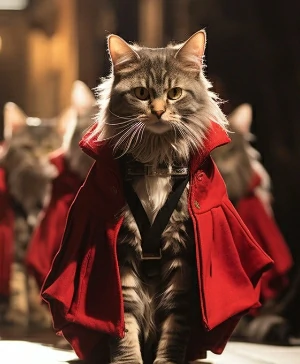 Cats wearing fashionable clothes at the runway show