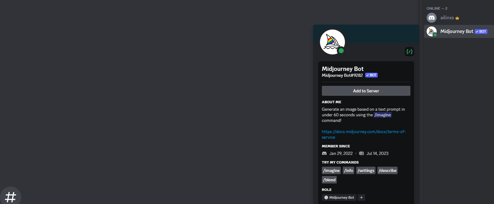 Click on 'Midjournal Bot', click on 'Add to Server', select the server we just created, and then authorization verification will be done. You can enter our server and see that the robot is already on our member list. This completes the task.