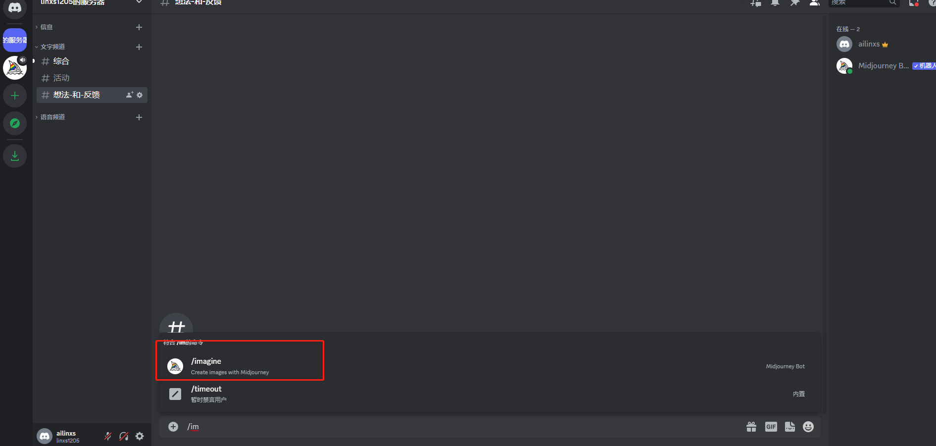 Return to our server and enter "/" in the input box below. A series of commands will pop up (if there is no pop-up window, log out and log in again). First, click "/image".