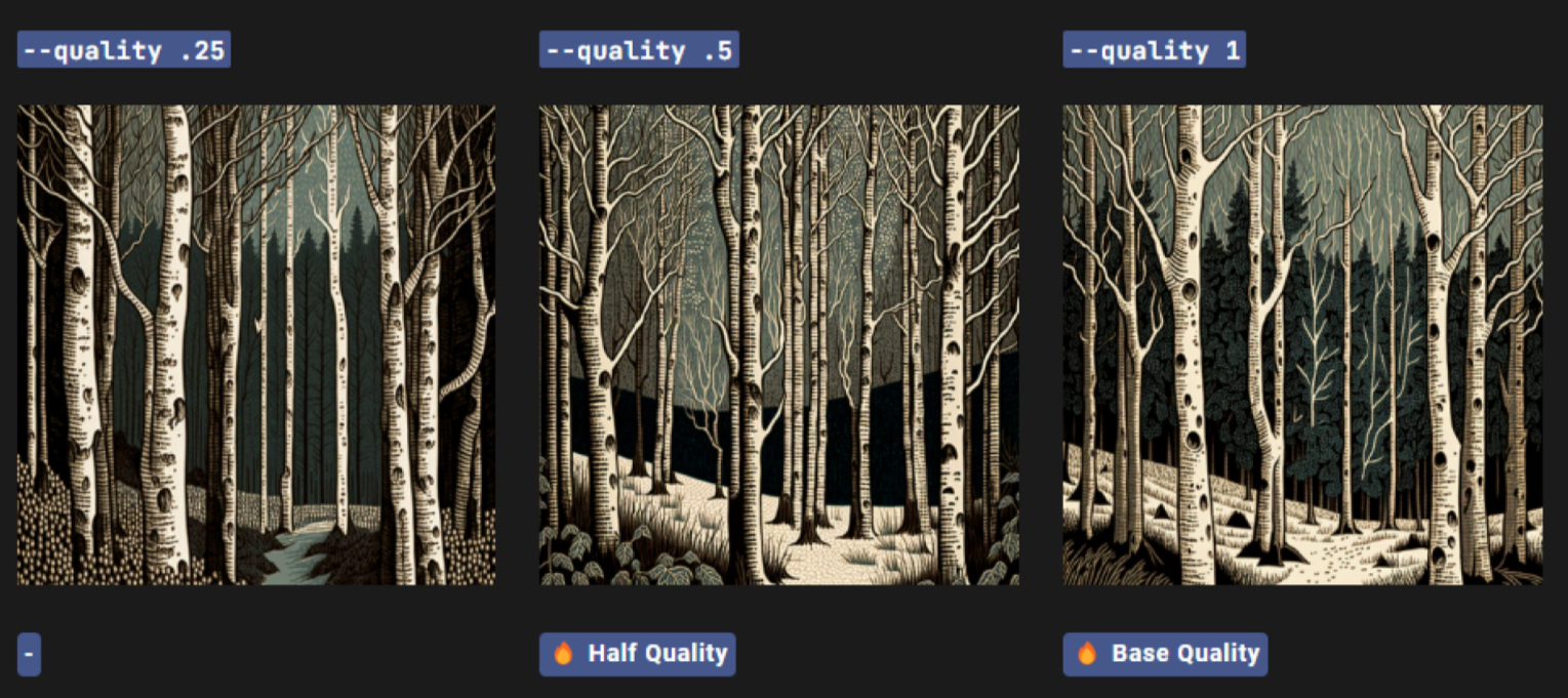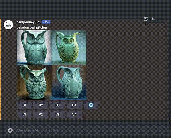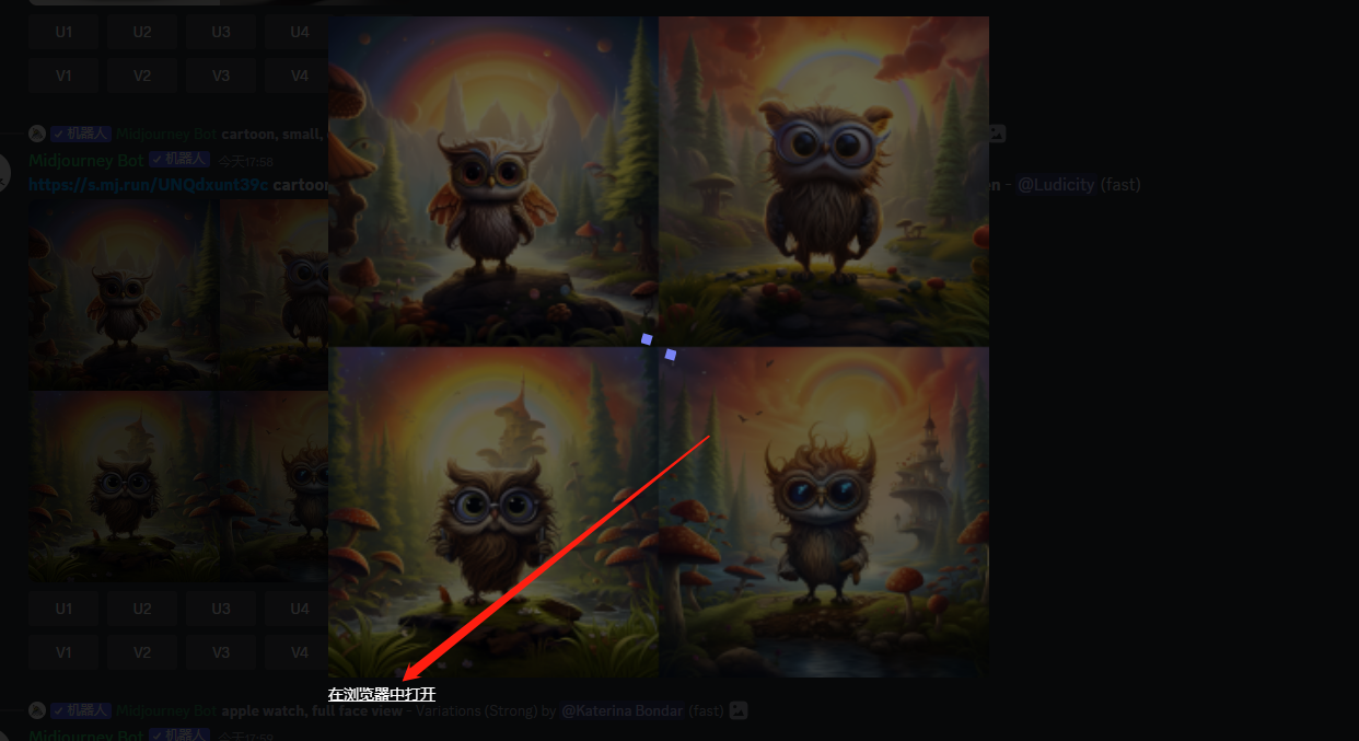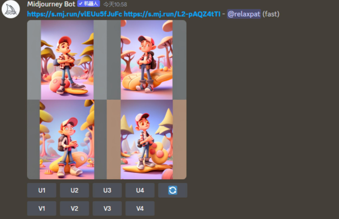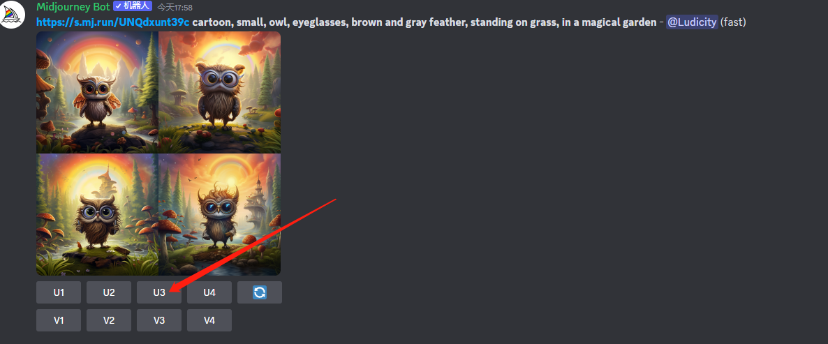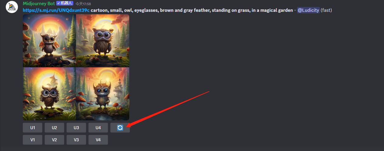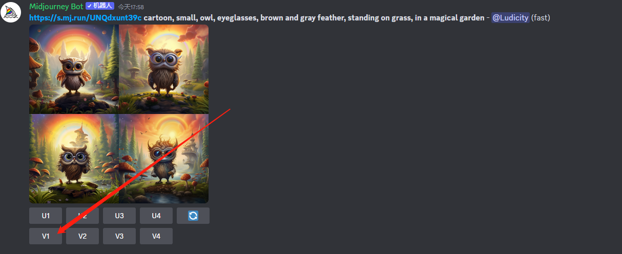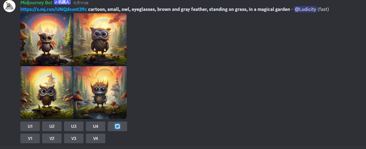 After the generation is completed, two rows of buttons will appear. U means to enlarge the image, U1/U2/U3/U4 means to enlarge one of the four images, and V means to use the composition of the image to regenerate a set of similar images. The order of V1/V2/V3/V4 is the same as that of U