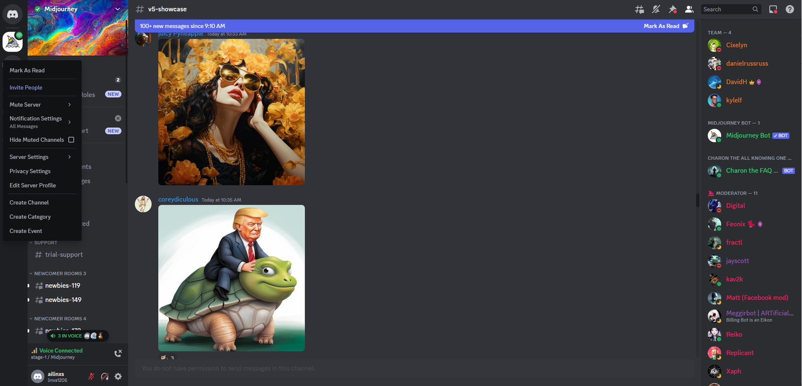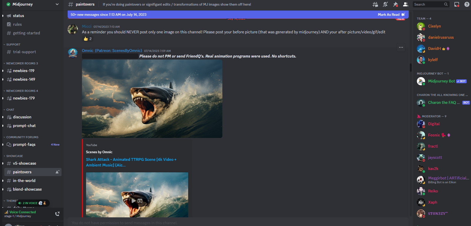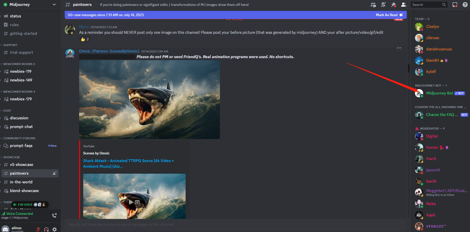 A lot of information has appeared, and this community is public. Many people are working here to create images. The left column is the server channel, which includes the Midjournal management channel, posting some updates, and the public's image channel. I suggest you check out how people create images for keywords in it, but it is not recommended to generate your own images here. There is too much information.