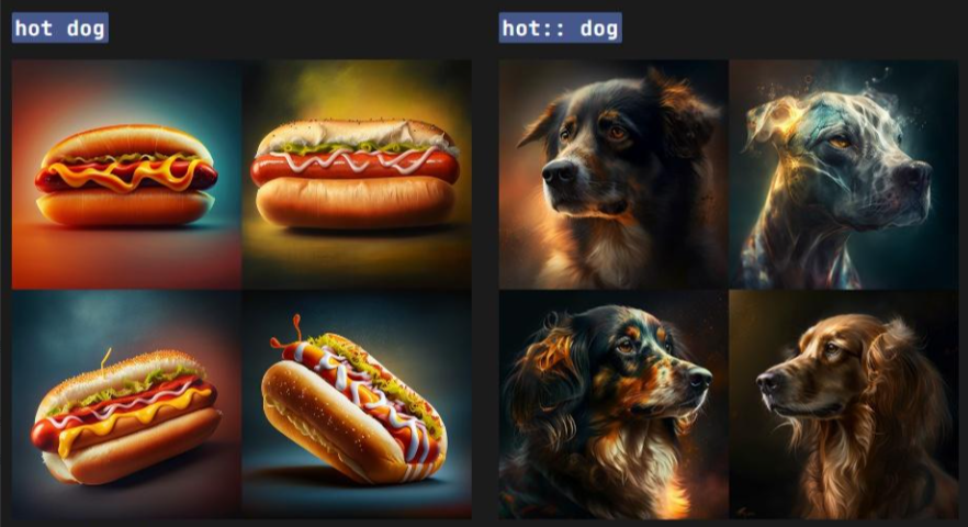 Add a double colon to the prompt to indicate to the Midjournal Bot that it should consider each part of the prompt separately. In the following example, for the prompt, all words of hot dog are considered together, and the Midjournal Bot generates an image of a delicious hot dog. If the prompt is divided into two parts, hot:: dog will separate the two concepts and create a warm image of the dog.