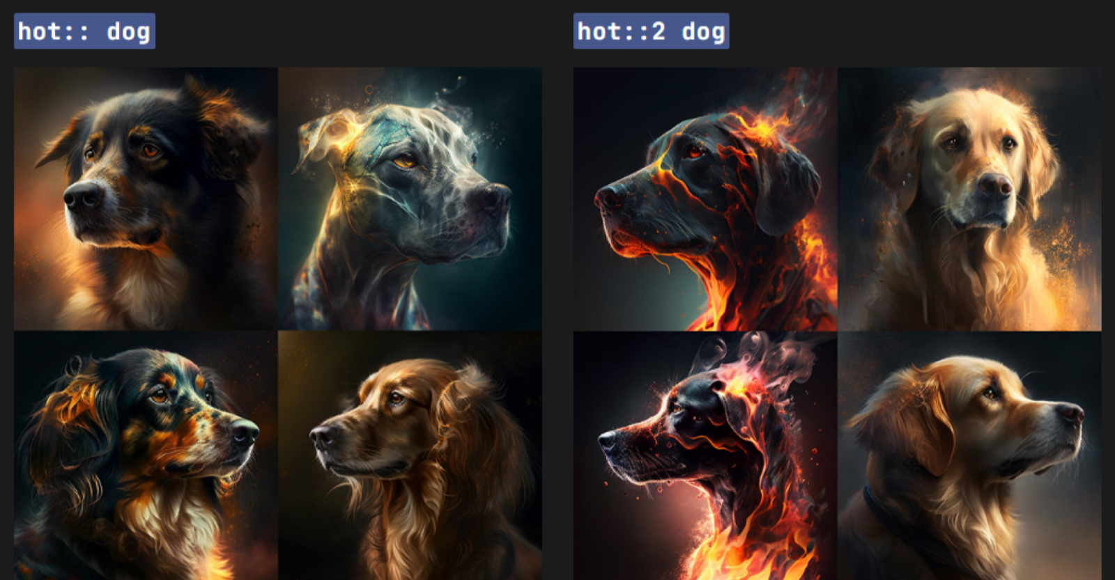 In the following example, the prompt hot:: dog generated a hot dog. Change the prompt to make the word "hot" hot:: 2 dog twice as important as the word "dog", resulting in an image of a very hot dog!