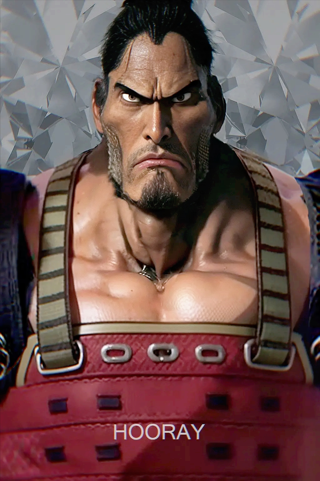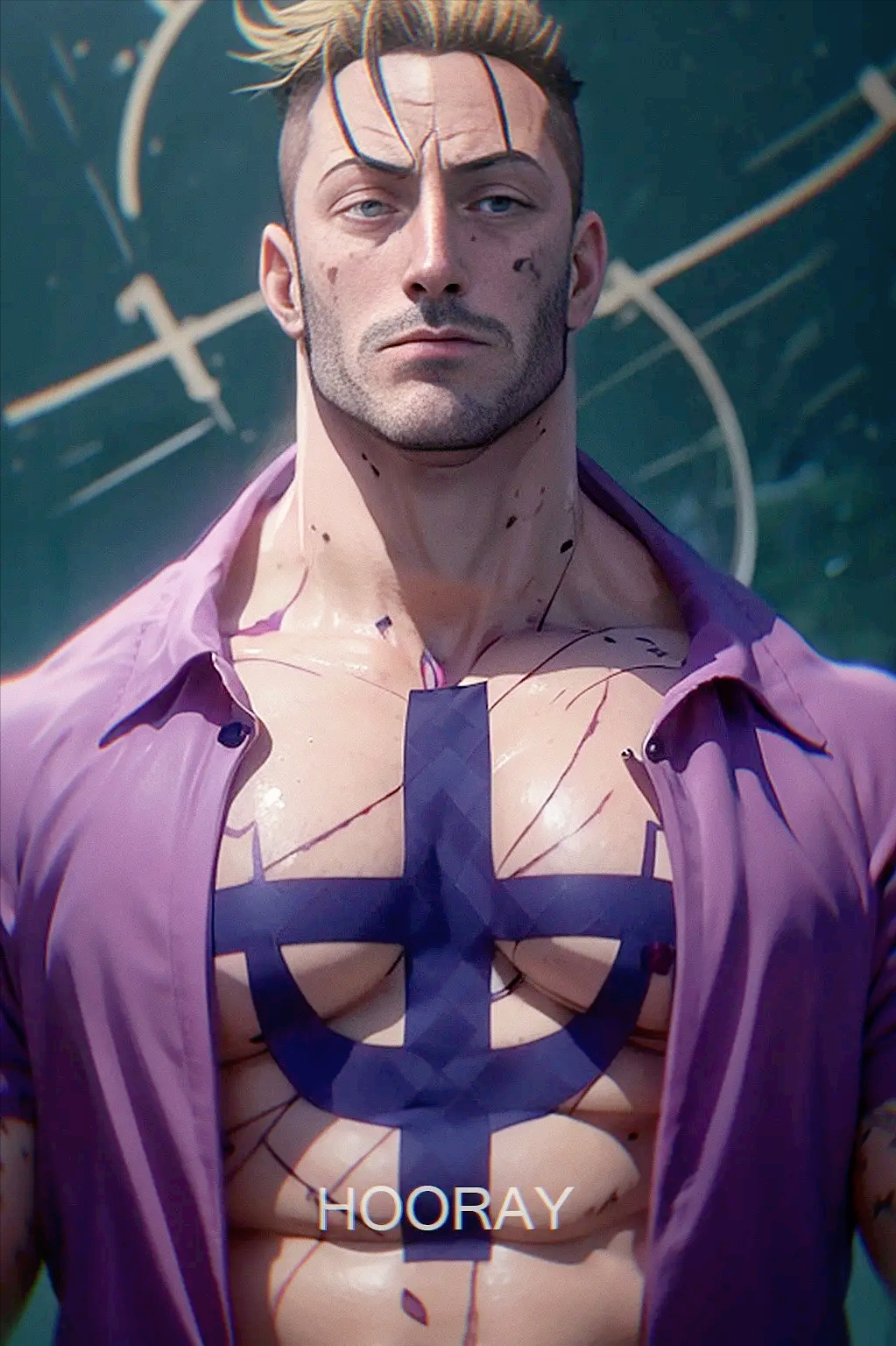 He is tall and bald, with a cigar in his mouth and a deep scar on his face. His weapon is a Flame Sword.