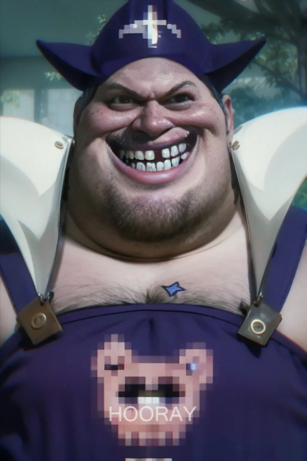 Bramank is relatively chubby and wears a triangular pirate hat. He has two pockets on his chin from which he can take out his gavel as a combat weapon.