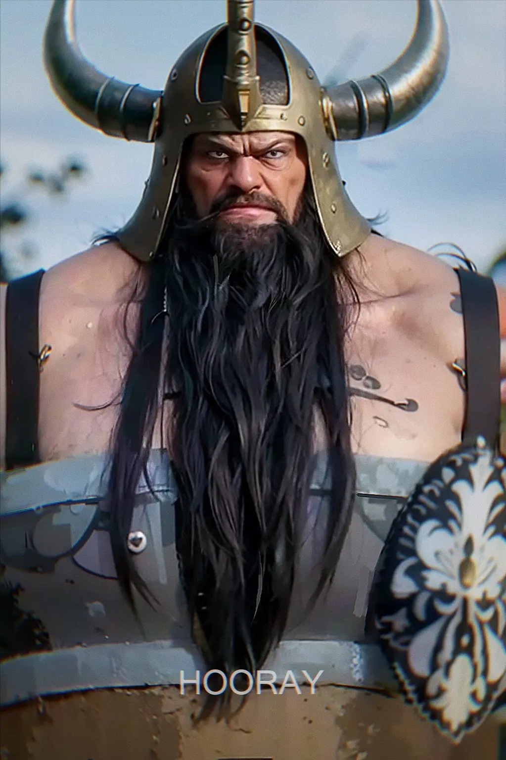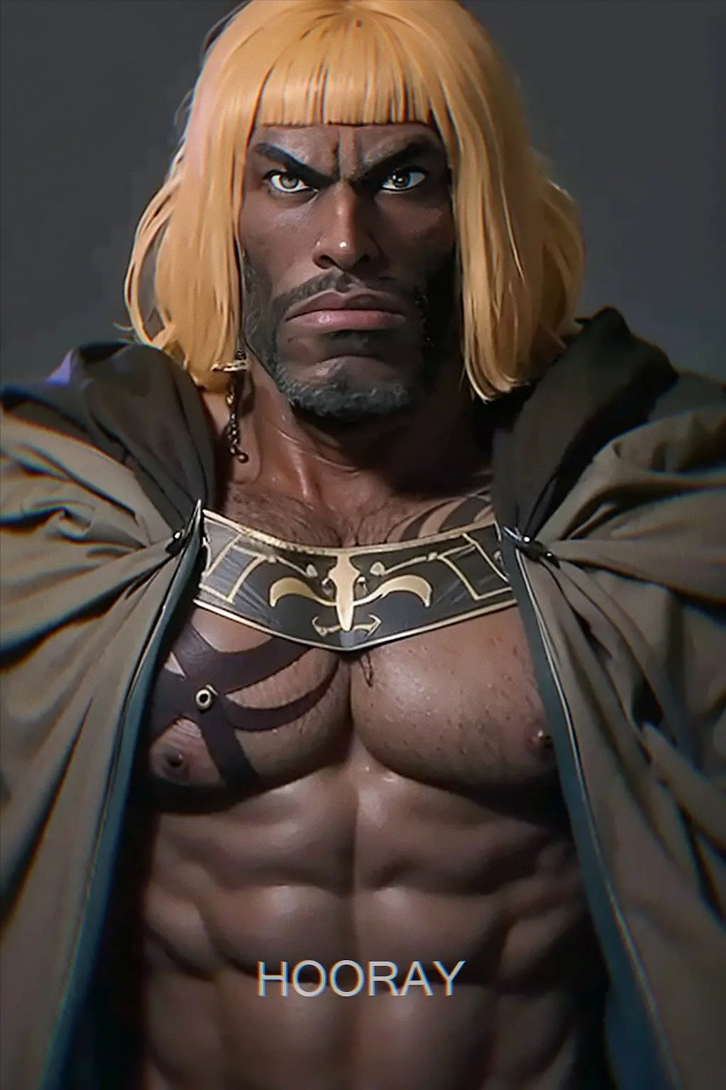 Jinguduo has dark skin, short golden hair, tattoos on the chest, a cloak, and iron armor on both arms.