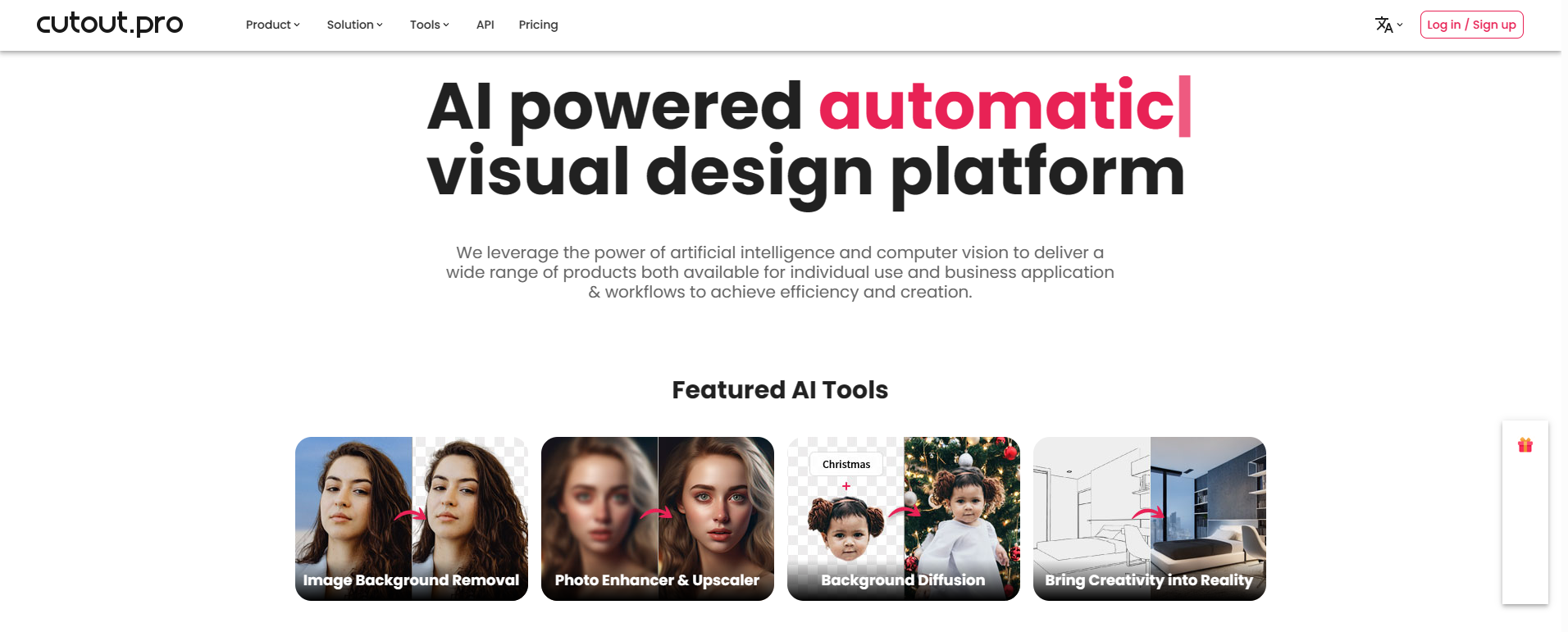 Cutout. Pro utilizes the power of artificial intelligence and computer vision to provide a wide range of products, including image enhancement, support for real people, anime virtual characters, image coloring, background diffusion, and other functions. It is a comprehensive AI image processing online toolbox.