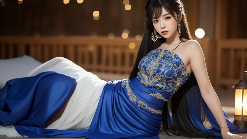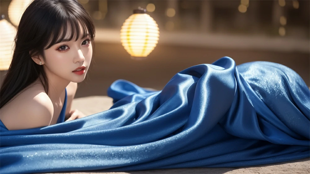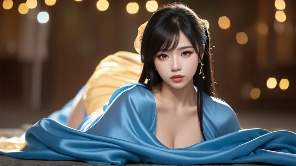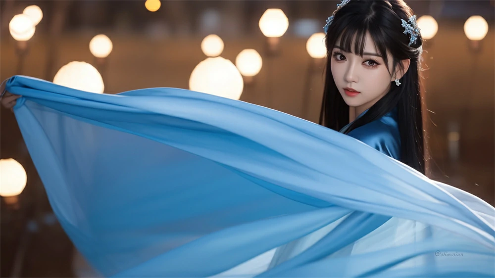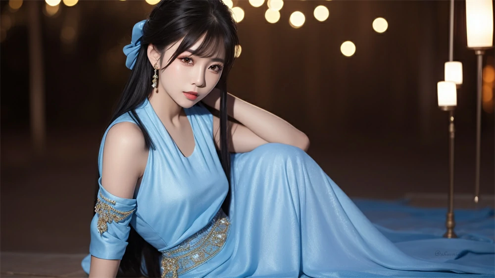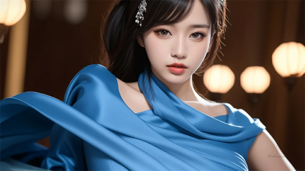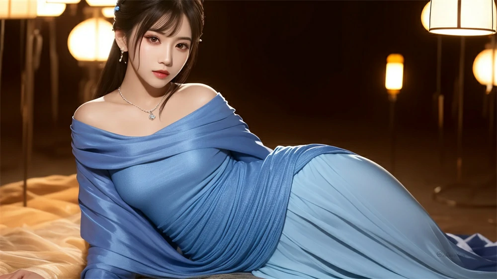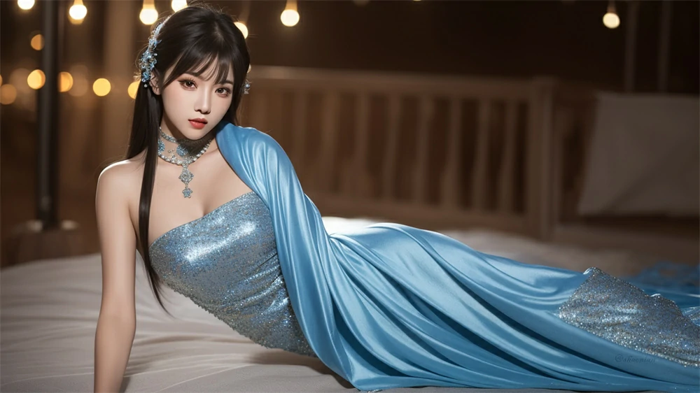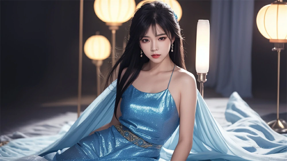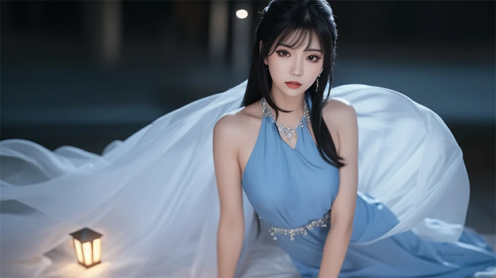 The blue suspender dress makes this girl more elegant and fresh, while giving a sense of elegance and tranquility, making it very suitable for wearing in spring and summer. The girl's dress is very simple, but it's just right. Her makeup is elegant and natural, making people feel very comfortable and friendly, giving them a warm feeling.