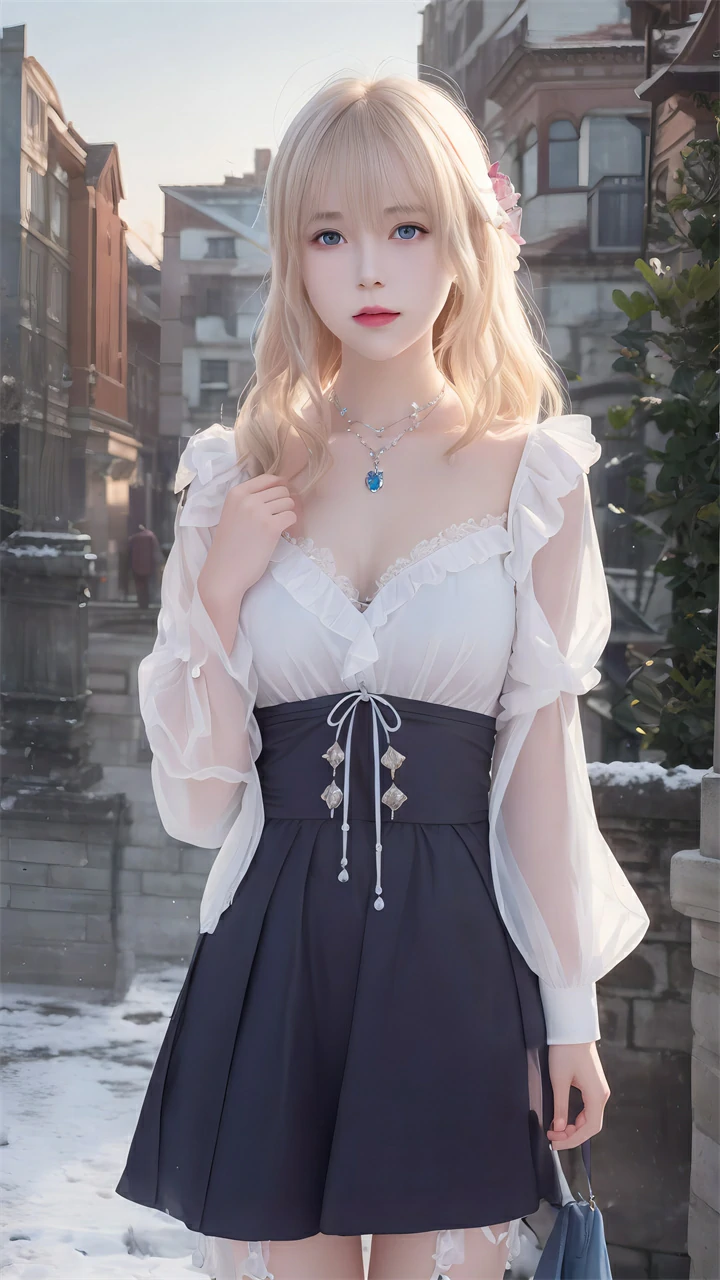 Violet looks very beautiful in British style clothing. She is wearing a high waisted long skirt, with a loose and natural hem and smooth and beautiful lines. The deep tones of the skirt complement the shirt with details, giving a sense of elegance.