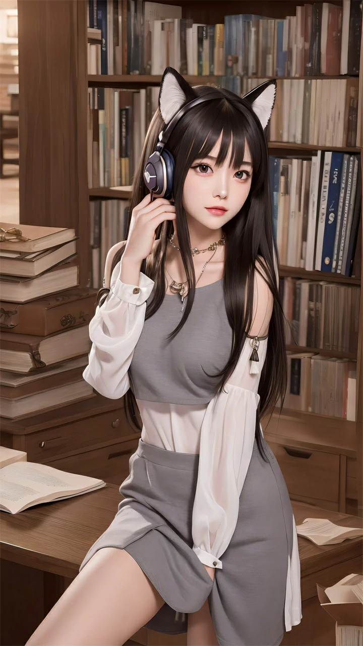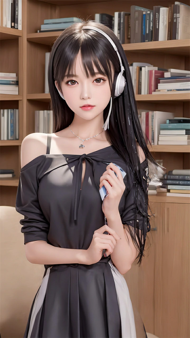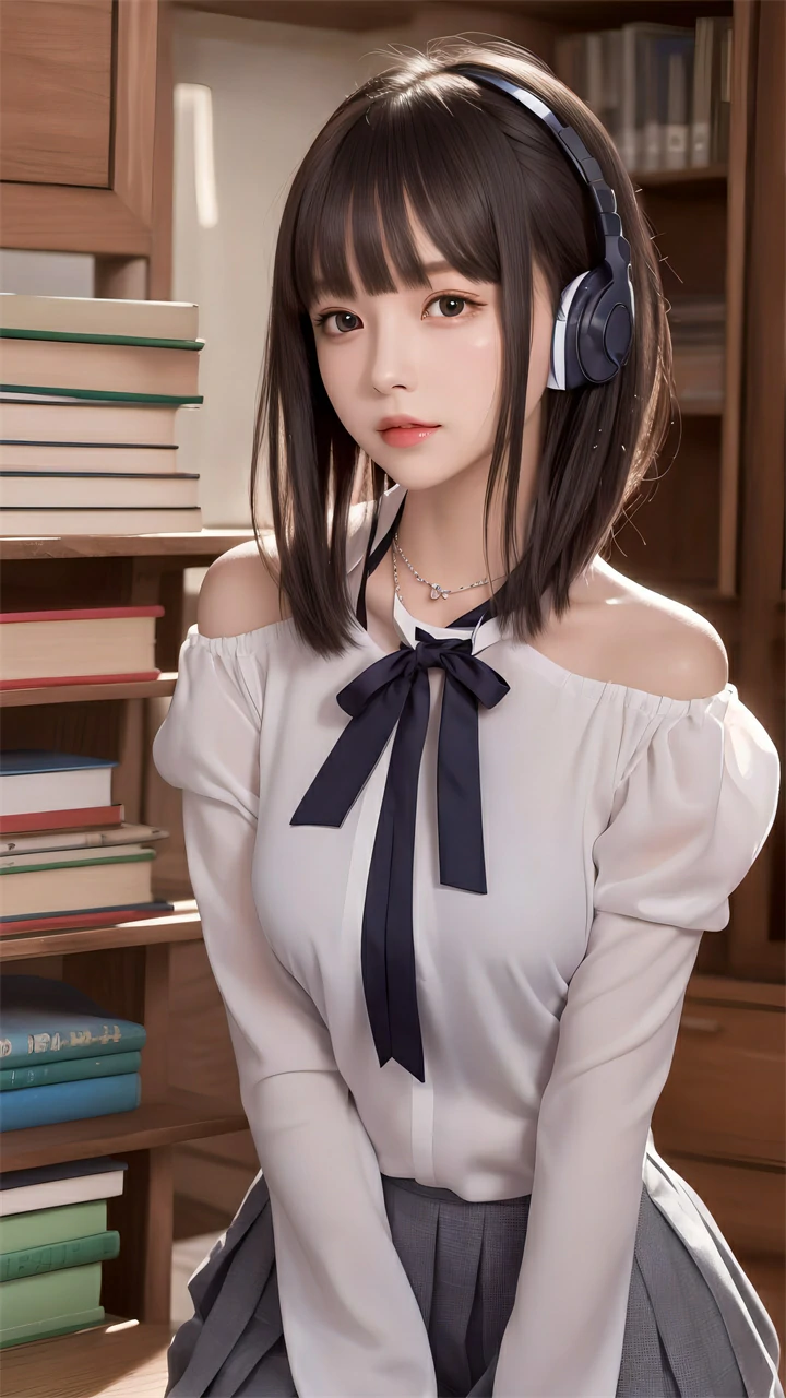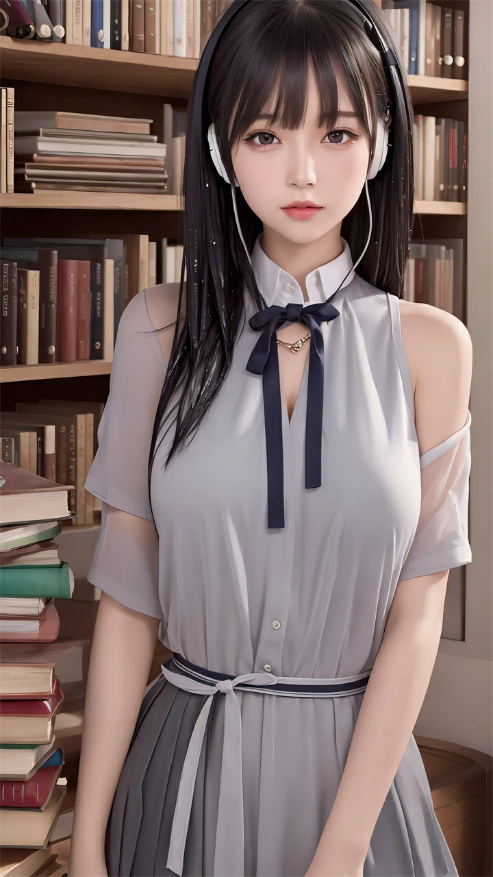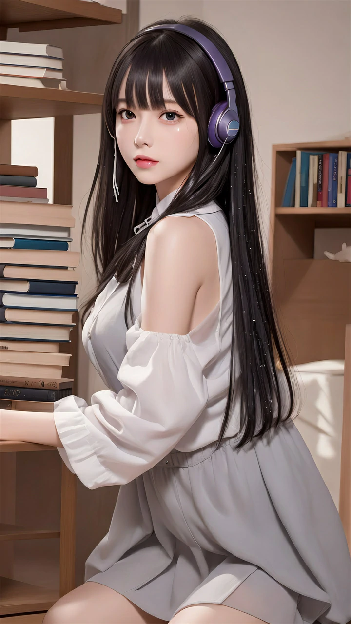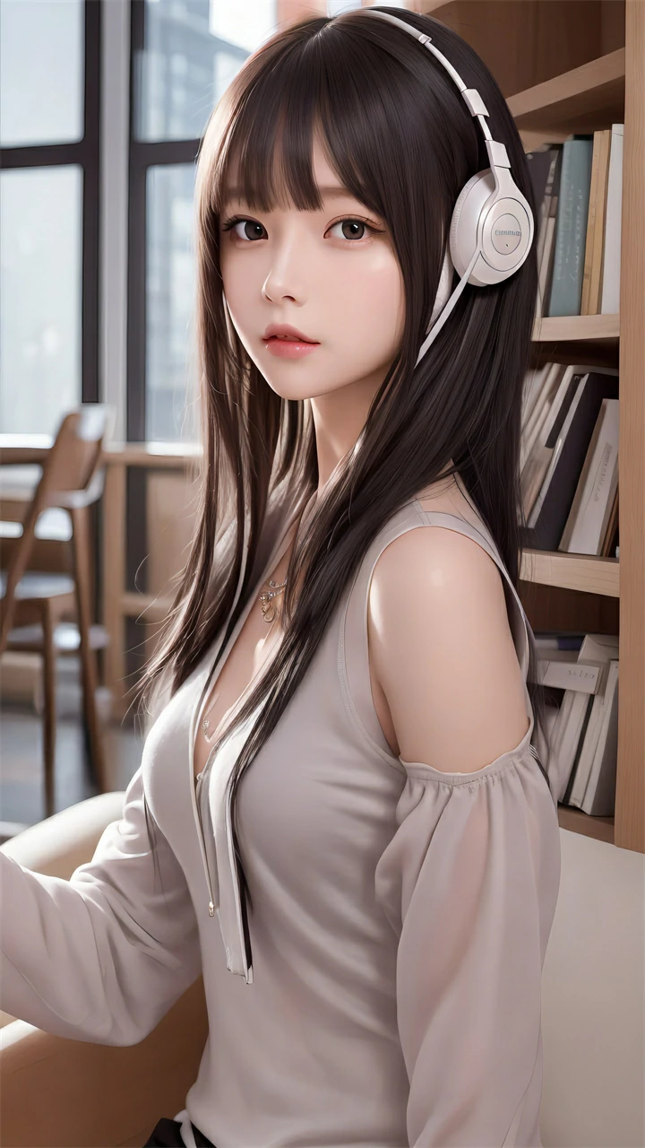 Encountering a girl wearing headphones in the library is a very beautiful thing. The earphone girl sat on the table in the corner, absorbed in reading a book, occasionally shaking her head as if trembling with the rhythm of the song. Her long hair was tied up, revealing her slender neck, which was very beautiful. She is wearing a small pair of headphones, which makes people feel like she has entered her own music world.