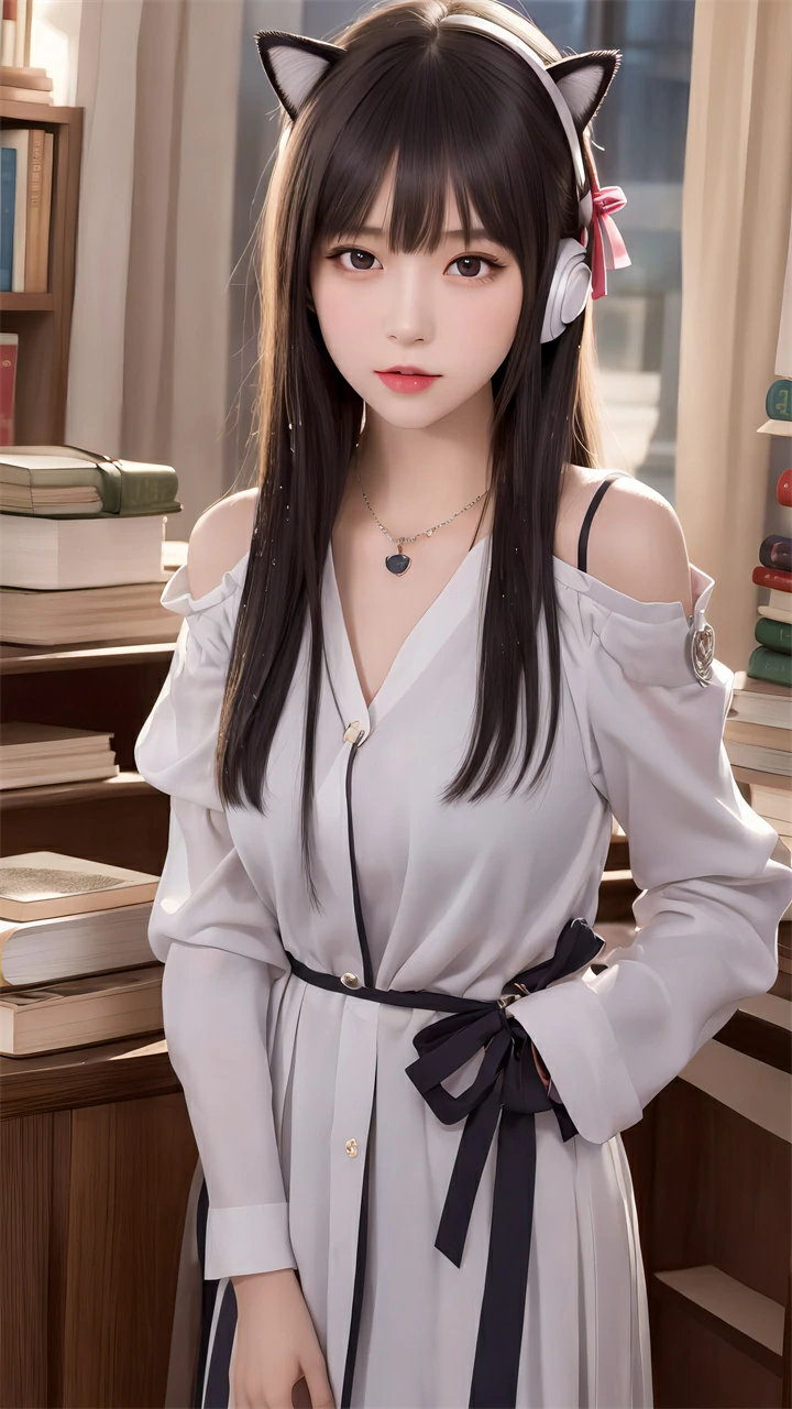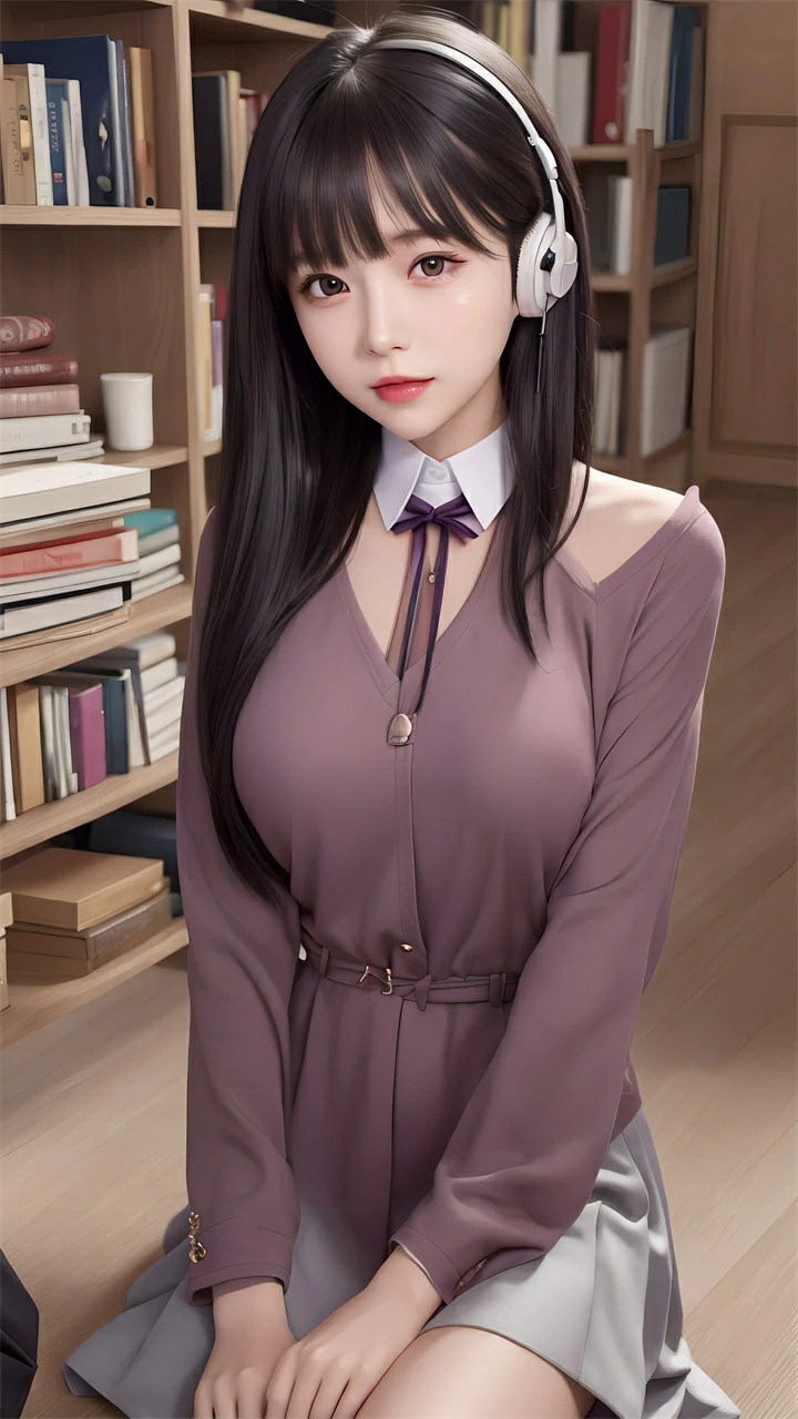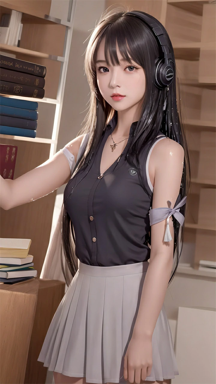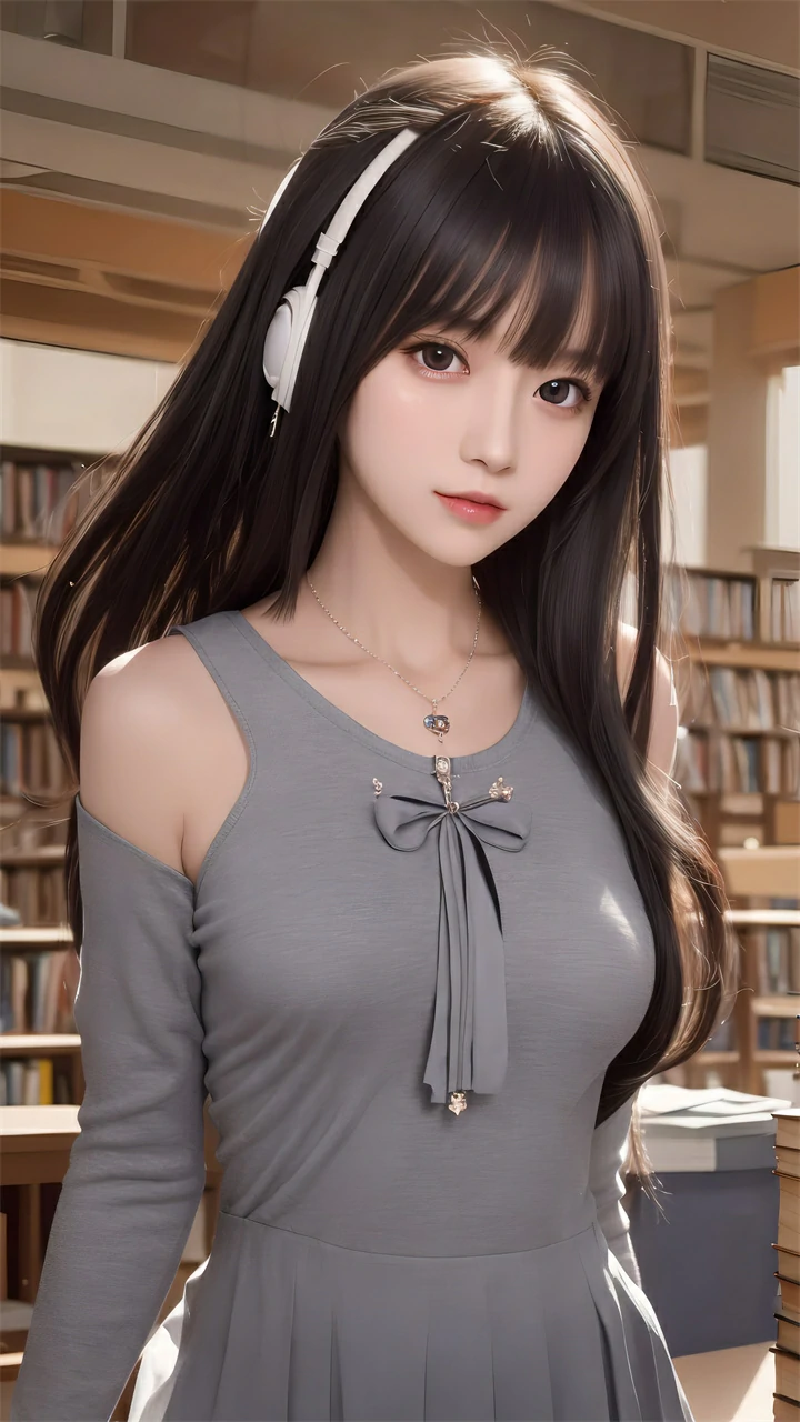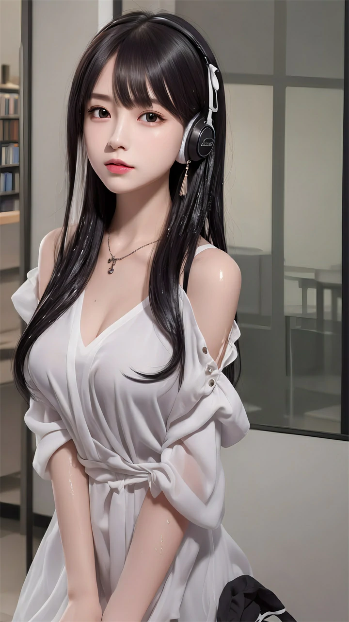 Encountering a girl wearing headphones in the library is a very beautiful thing. The earphone girl sat on the table in the corner, absorbed in reading a book, occasionally shaking her head as if trembling with the rhythm of the song. Her long hair was tied up, revealing her slender neck, which was very beautiful. She is wearing a small pair of headphones, which makes people feel like she has entered her own music world.