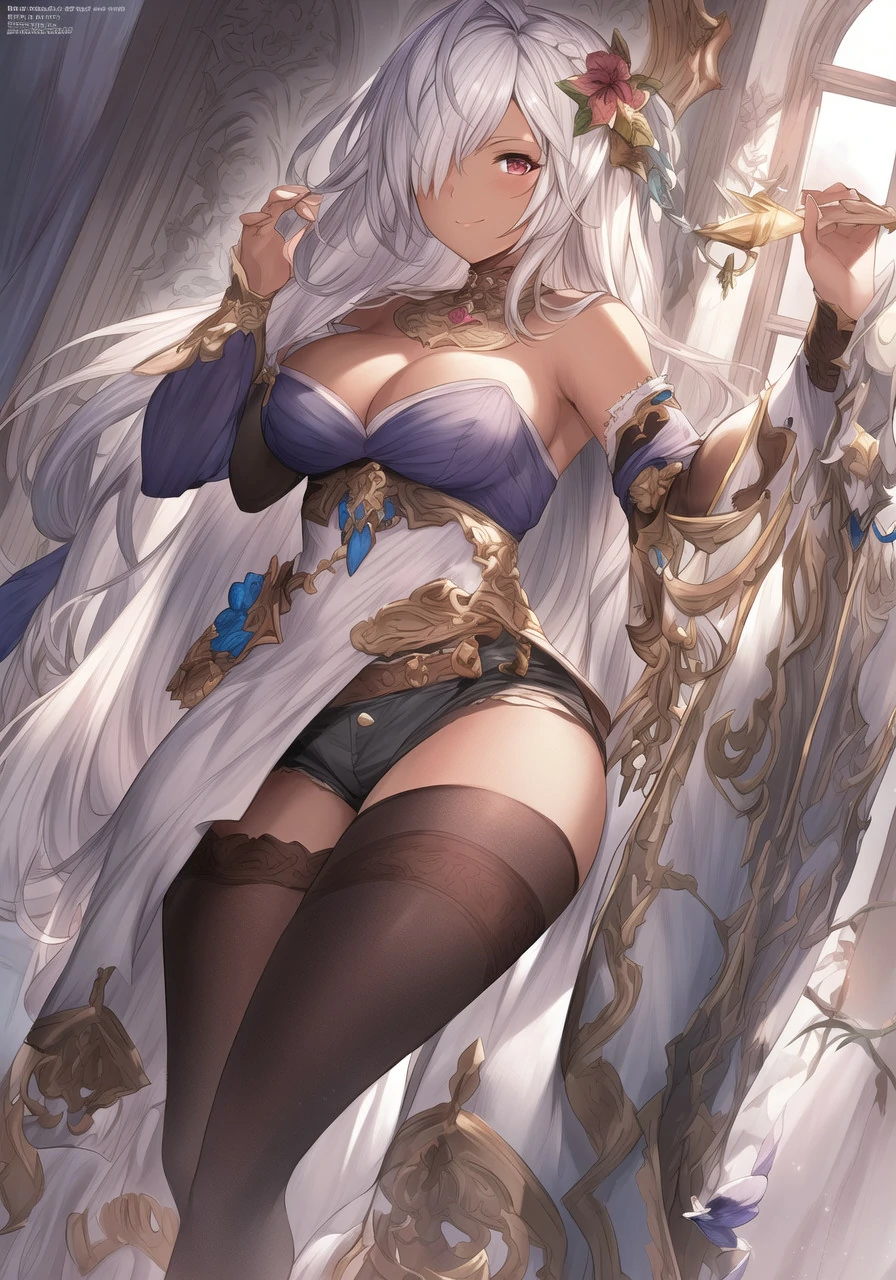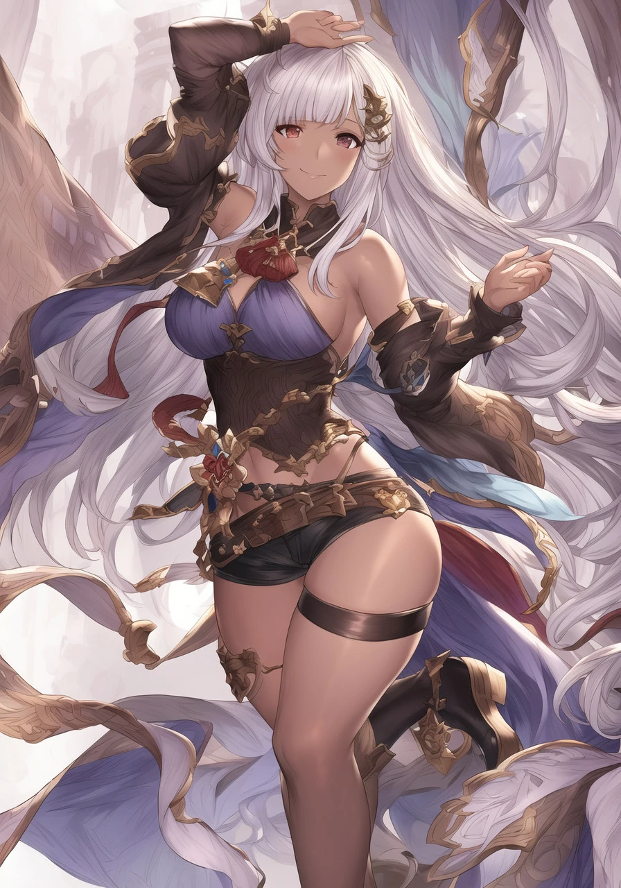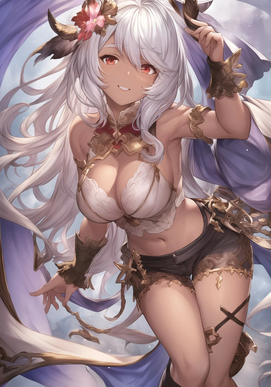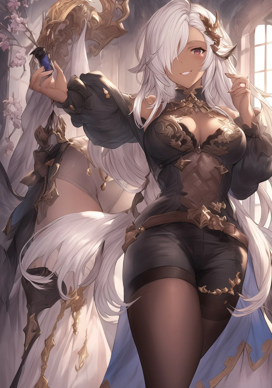 This wheat skinned white haired girl is a unique scenery. Her skin was tanned to a wheat color, harmonious with her silver hair. Her black eyes were as deep as paint, bright and magnificent. Her slightly curled lips exuded a natural pink color, and when she smiled slightly, the whole person became playful and cute. Her figure is petite and delicate, exuding a beautiful feminine vibe everywhere.