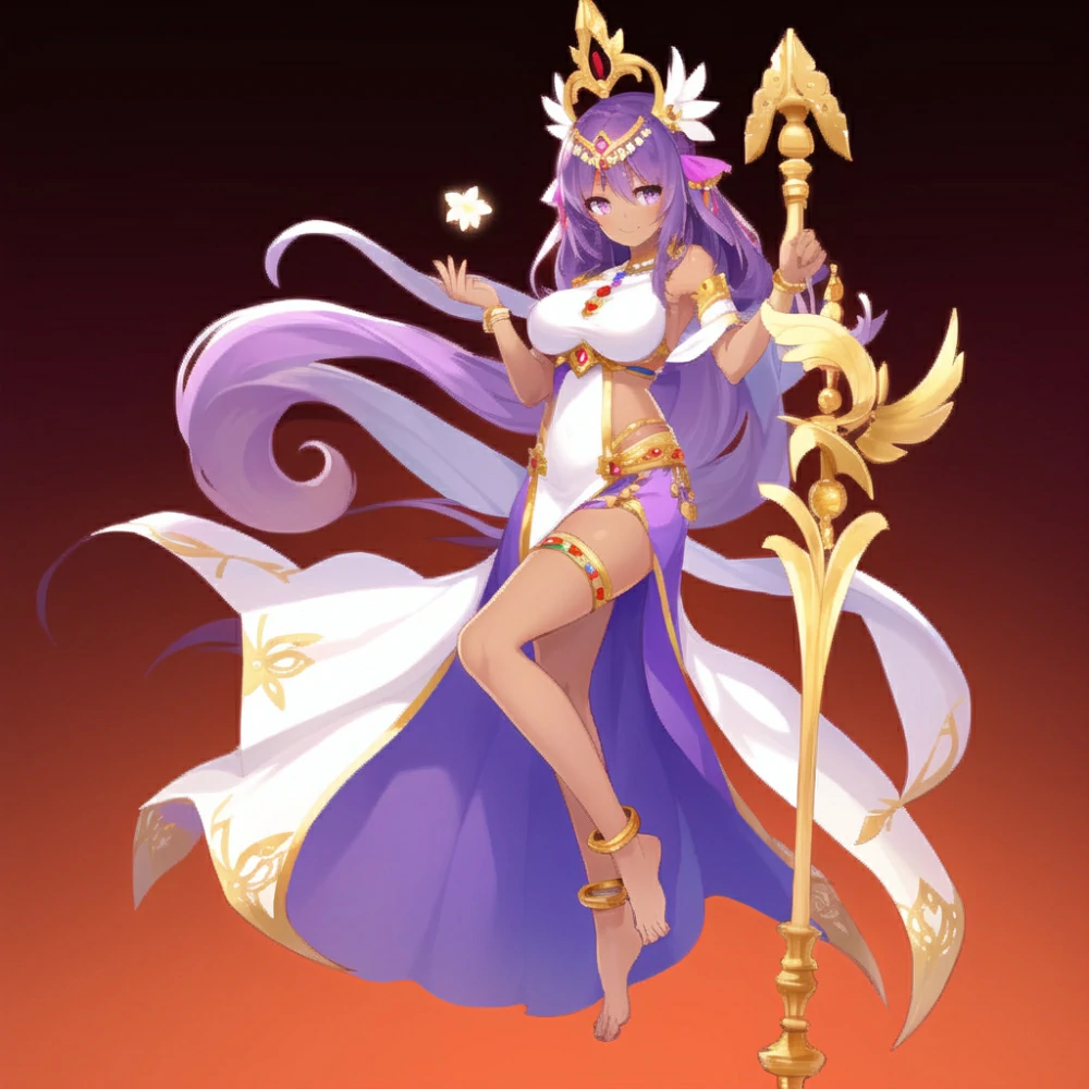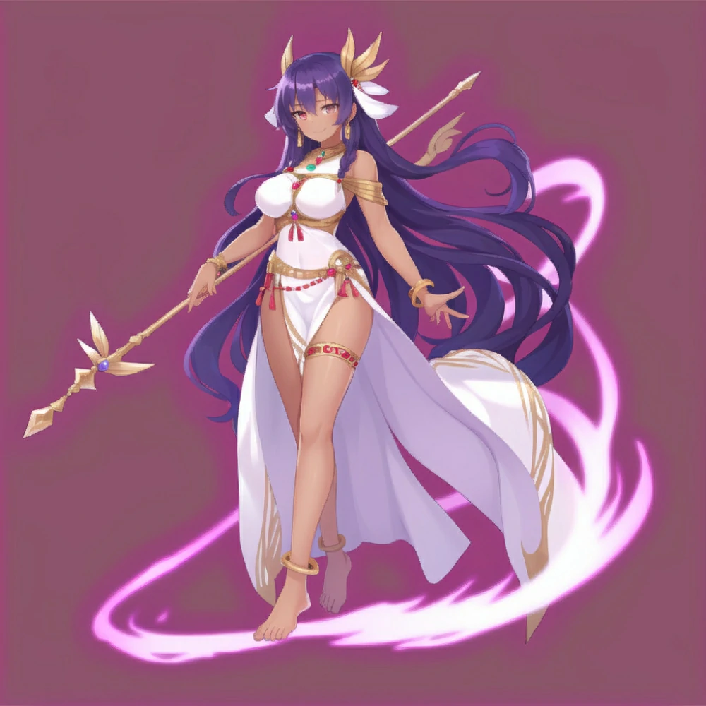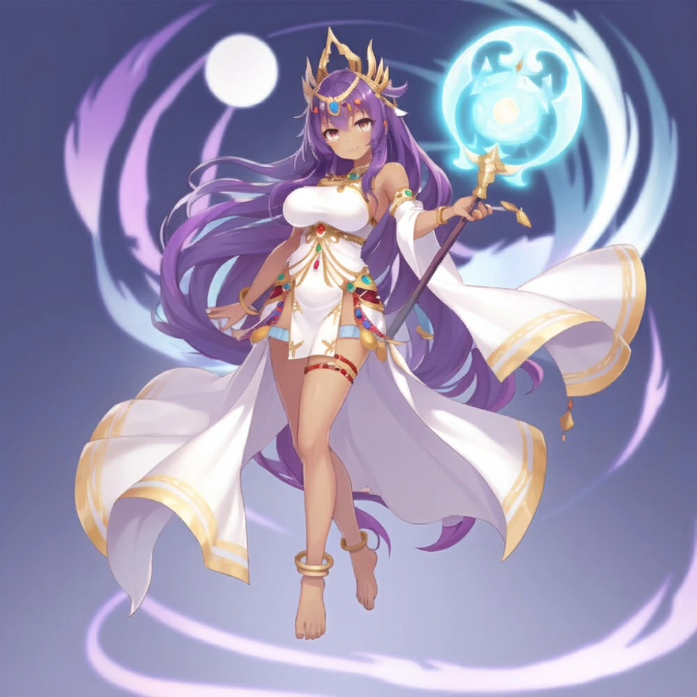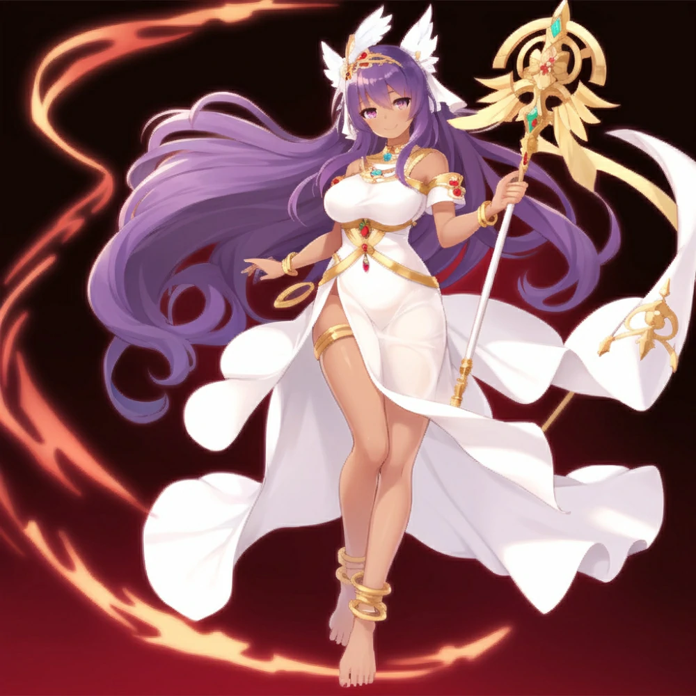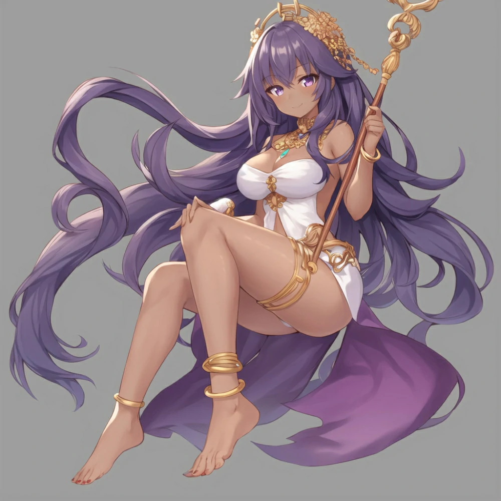 She is a goddess with charming purple long hair, always attracting people's attention whenever she passes by. Her long hair is soft, smooth, and beautiful, making it irresistible to touch. Her eyes sparkle with intelligence and wit, always bringing a sense of pleasure to people.