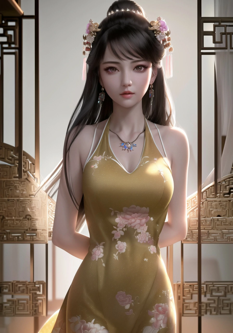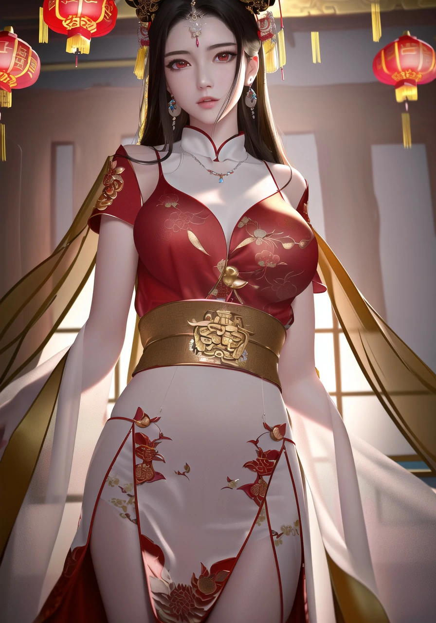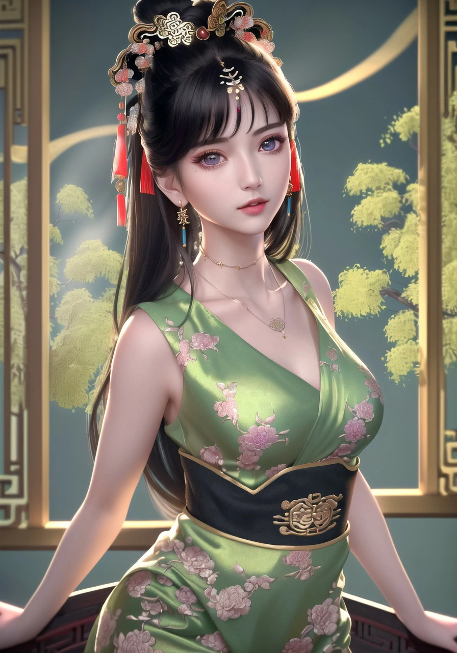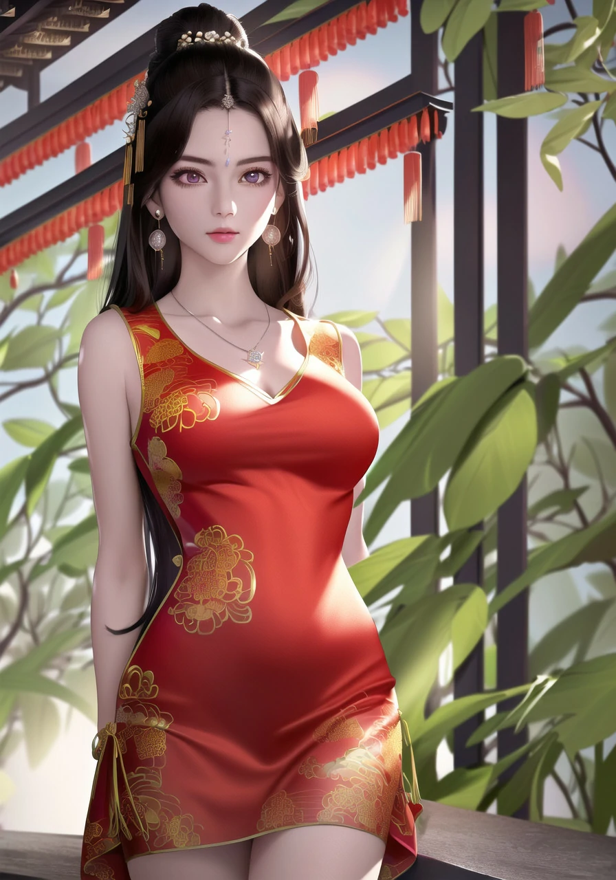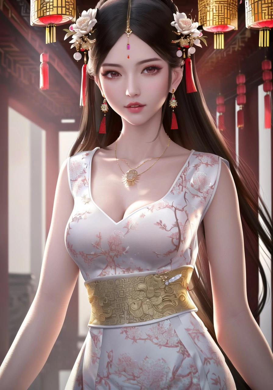 In the palace, a beautiful woman dressed in cheongsam is like a blooming flower, beautiful and moving. Her cheongsam tightly fits her body, highlighting her charming curves and showcasing her noble and graceful temperament. The details on cheongsam are very exquisite, making her beauty even more elegant and luxurious. Her skin color is as smooth and delicate as white jade, emitting an alluring radiance. Her eyes were bright and eerie, as if harboring endless wisdom and wit. Her red lips lifted slightly, like a cherry blossom with a smile, making people intoxicated by her beauty.