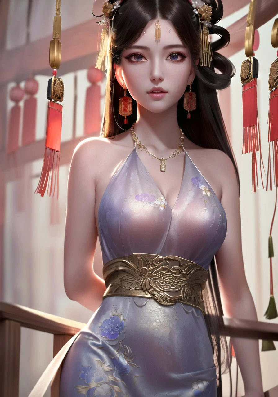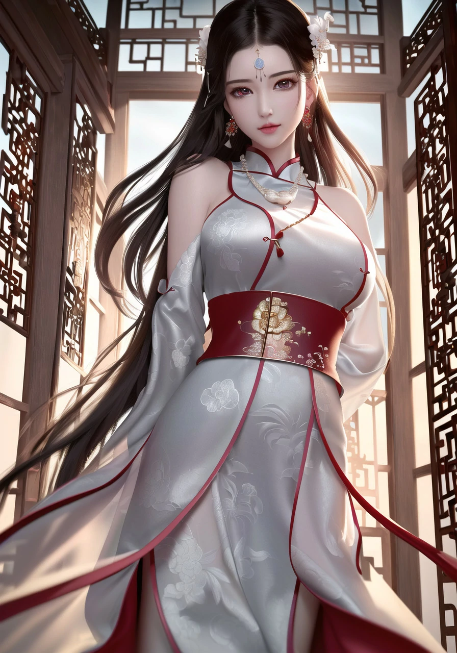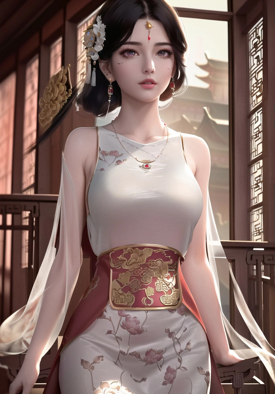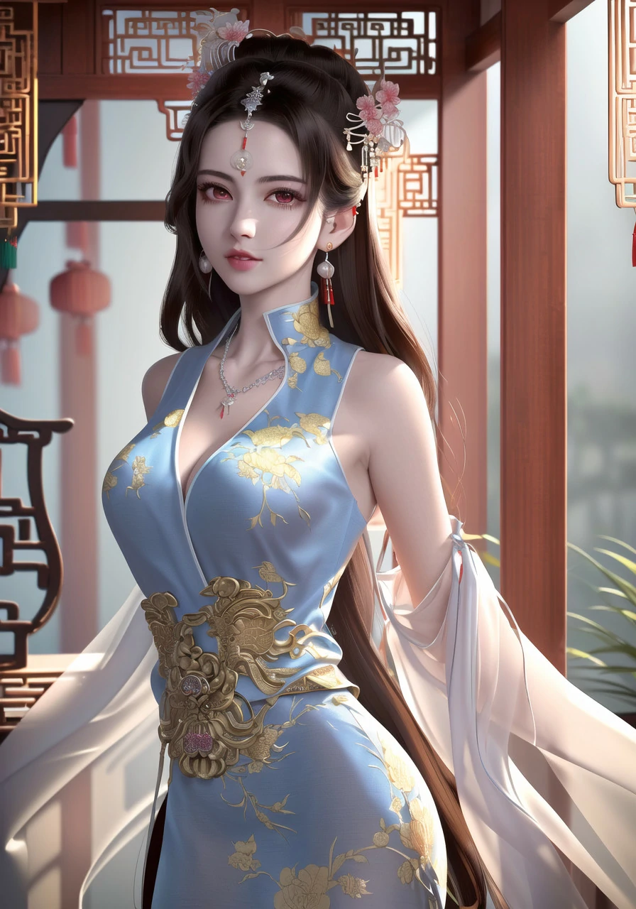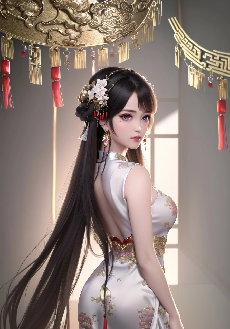 In the palace, a beautiful woman dressed in cheongsam is like a blooming flower, beautiful and moving. Her cheongsam tightly fits her body, highlighting her charming curves and showcasing her noble and graceful temperament. The details on cheongsam are very exquisite, making her beauty even more elegant and luxurious. Her skin color is as smooth and delicate as white jade, emitting an alluring radiance. Her eyes were bright and eerie, as if harboring endless wisdom and wit. Her red lips lifted slightly, like a cherry blossom with a smile, making people intoxicated by her beauty.