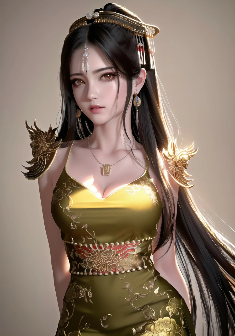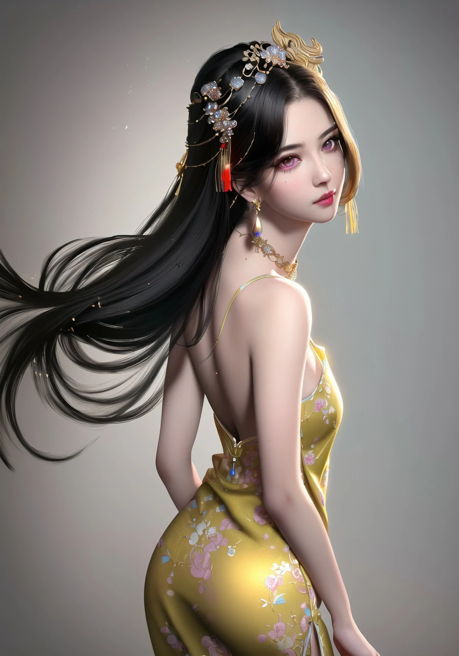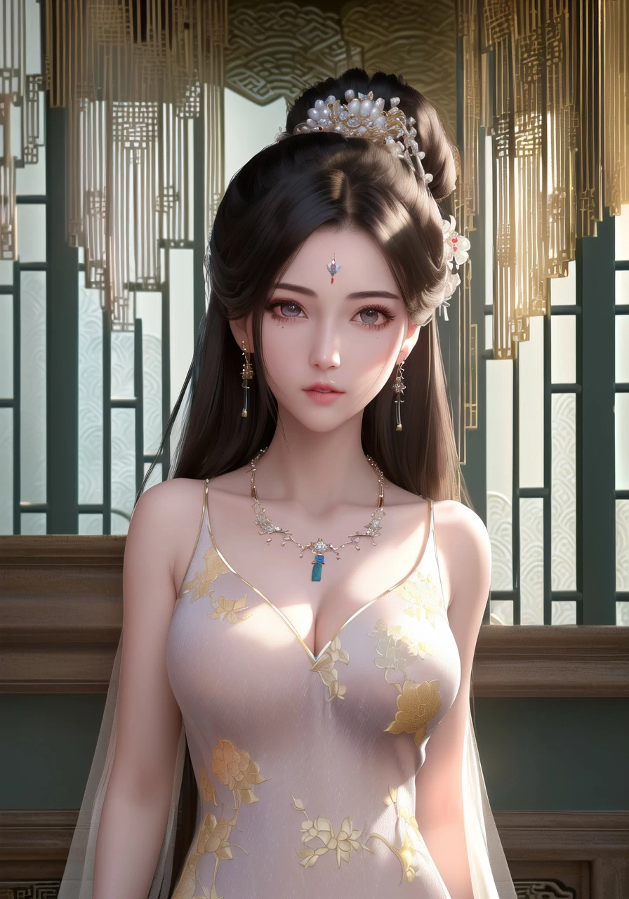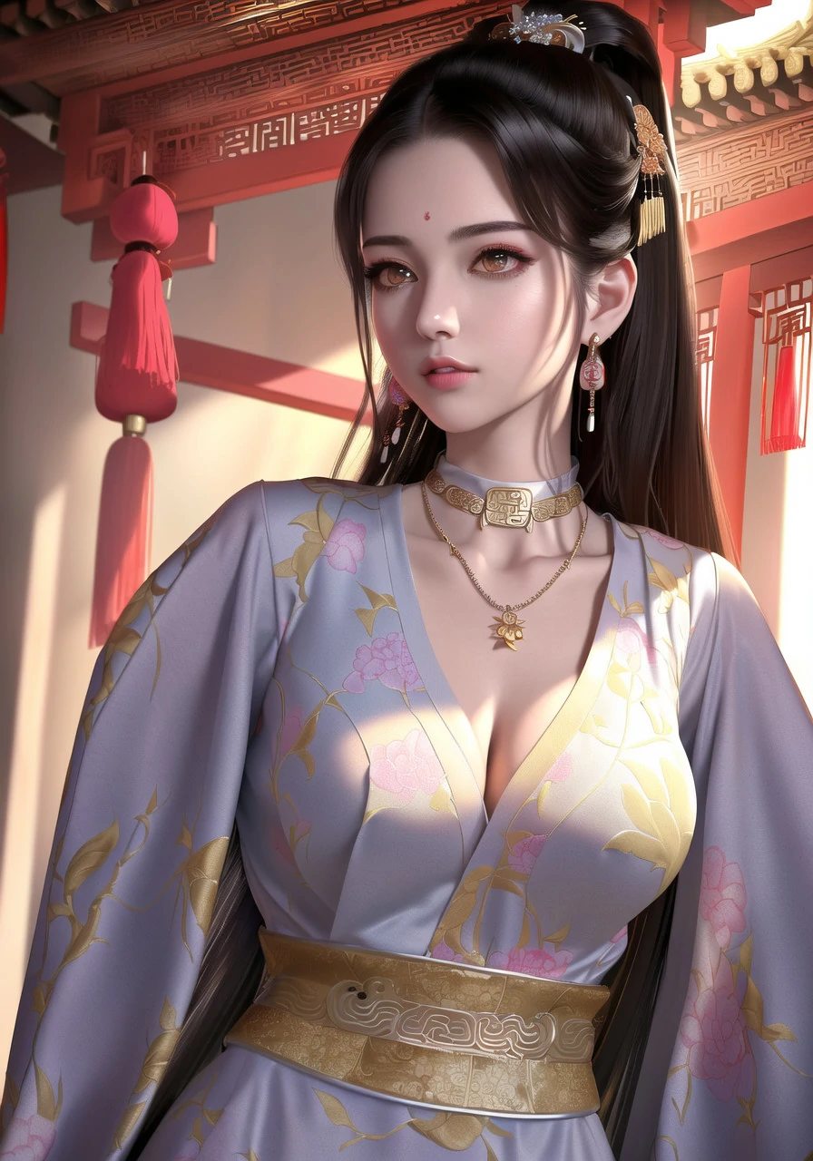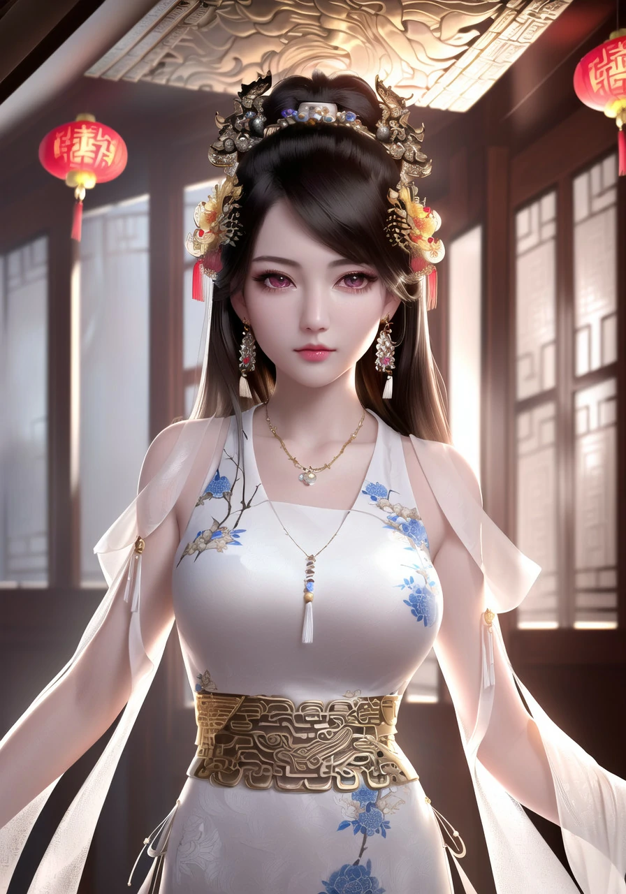 In the palace, a beautiful woman dressed in cheongsam is like a blooming flower, beautiful and moving. Her cheongsam tightly fits her body, highlighting her charming curves and showcasing her noble and graceful temperament. The details on cheongsam are very exquisite, making her beauty even more elegant and luxurious. Her skin color is as smooth and delicate as white jade, emitting an alluring radiance. Her eyes were bright and eerie, as if harboring endless wisdom and wit. Her red lips lifted slightly, like a cherry blossom with a smile, making people intoxicated by her beauty.