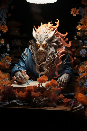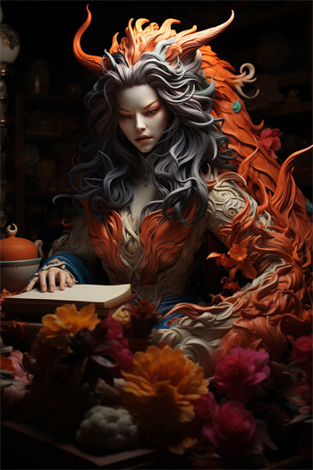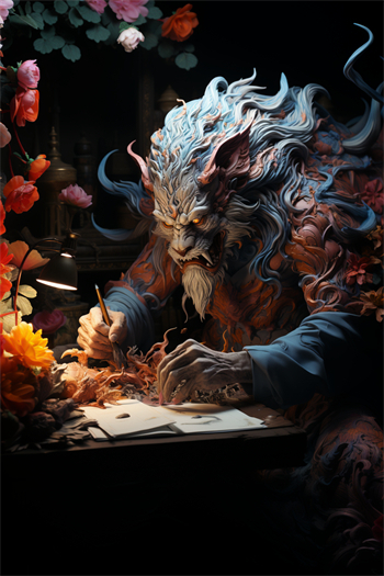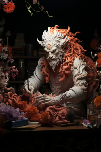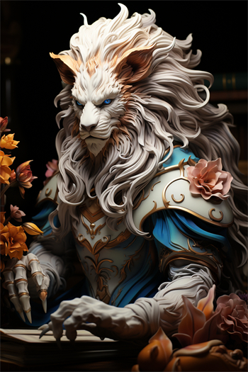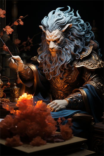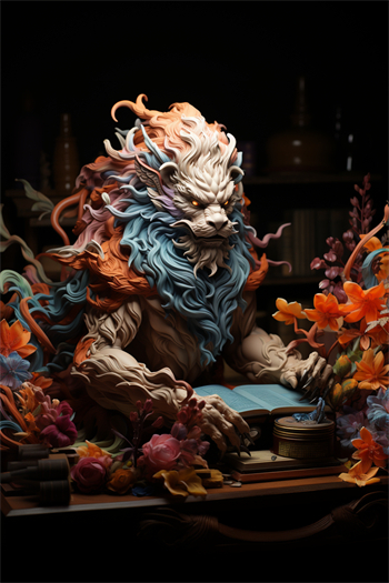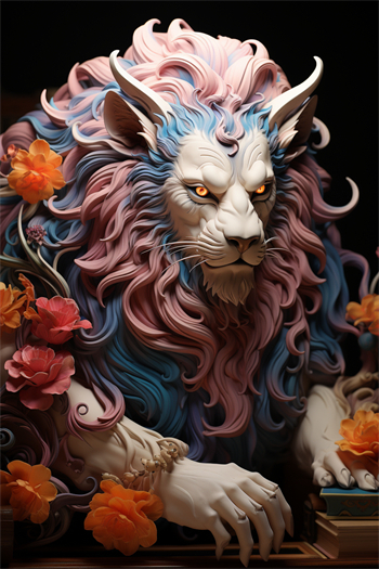 The lion's body is permeated with the image of humans, as if it were a fusion of humans and beasts in mythological legends. The lion's body is delicate and robust, with each muscle accurately depicted, showcasing the aesthetics of strength and strength. The upper part of the human body stands on the back of the lion, majestically overlooking its surroundings.