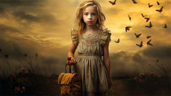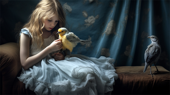 The blonde girl and the bird, this is a warm and lovely scene. A little girl may have golden hair, and she may interact with birds in outdoor gardens, parks, or forests. Birds may be different types of birds, they may fly to the little girl's side, or the little girl may sprinkle some food to make them close.