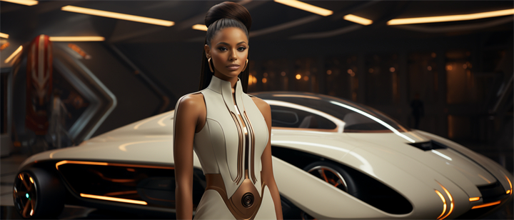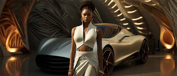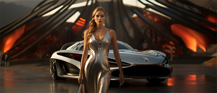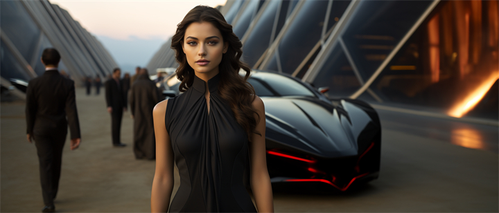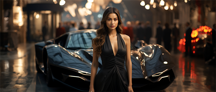 When showcasing luxury cars, car models usually wear fashionable clothing and stand next to or in the display area to showcase the vehicle's exterior design and various features. They will emphasize the luxury, performance, and uniqueness of luxury cars through posture, facial expressions, and body language.