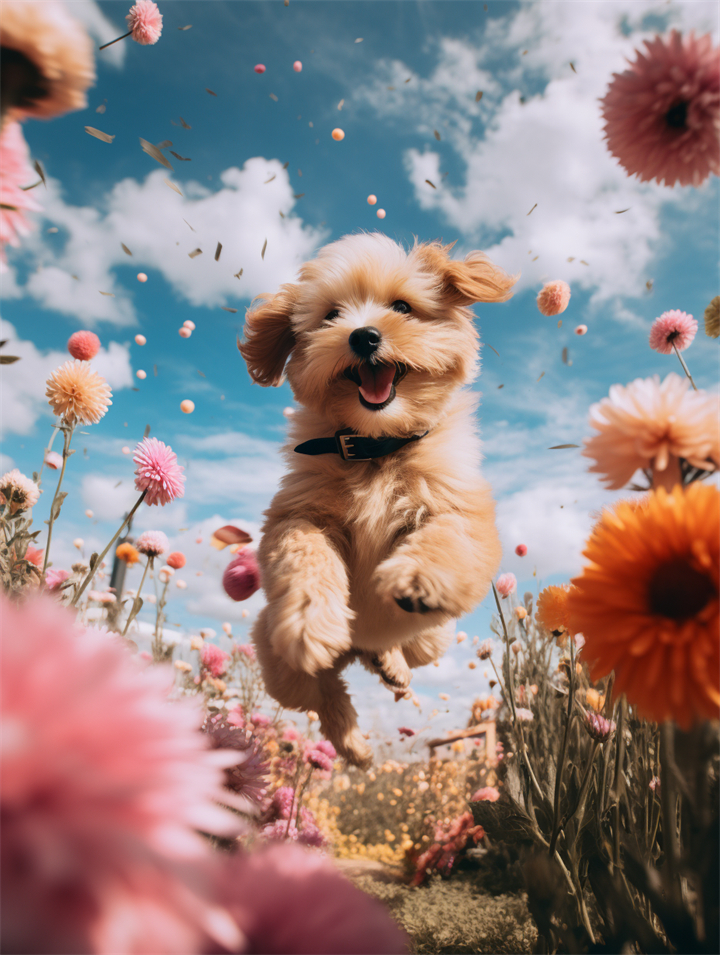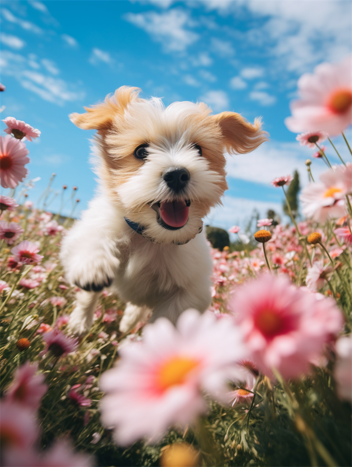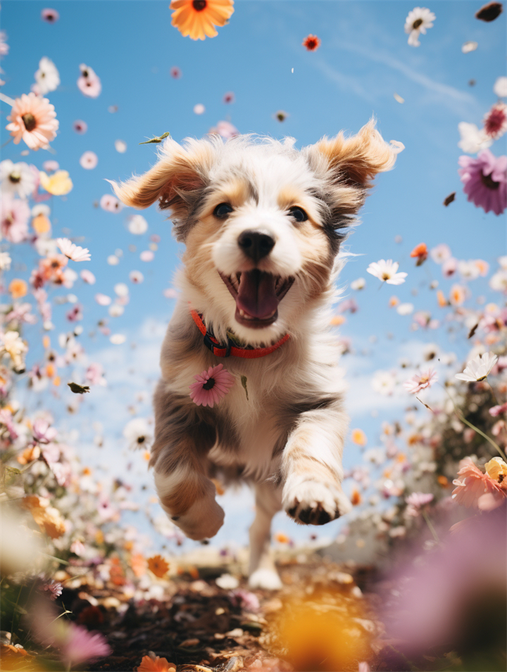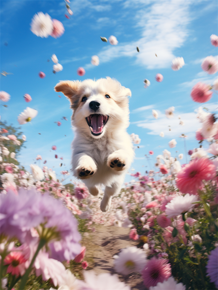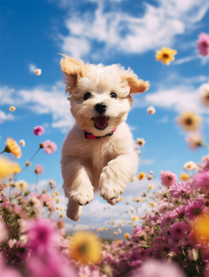 The little dog in the spring garden is cute and lively. In the warm spring, various flowers bloom in the garden, the sun shines on the green grass, and the little dog jumps and runs among the flowers, bringing joy and vitality to people.The little dog was very excited to smell the fragrance of the flowers, jumped up and bit a beautiful flower, or chased after the petals dancing in the wind.