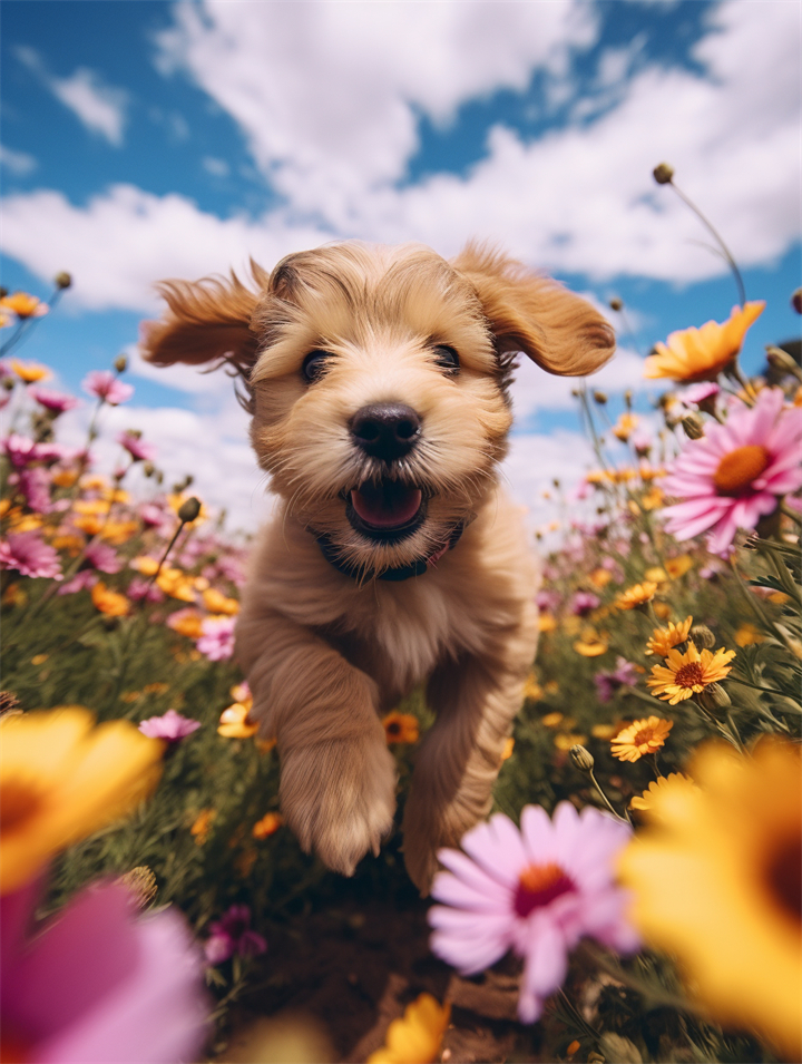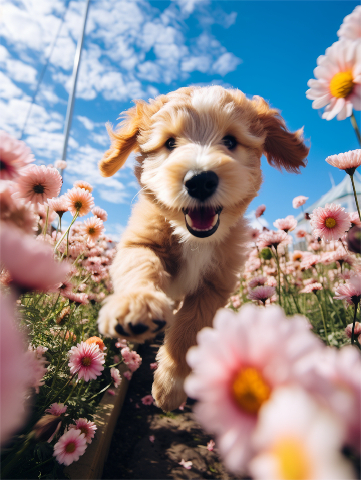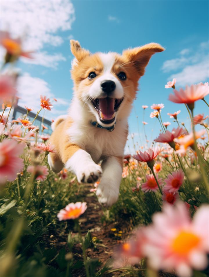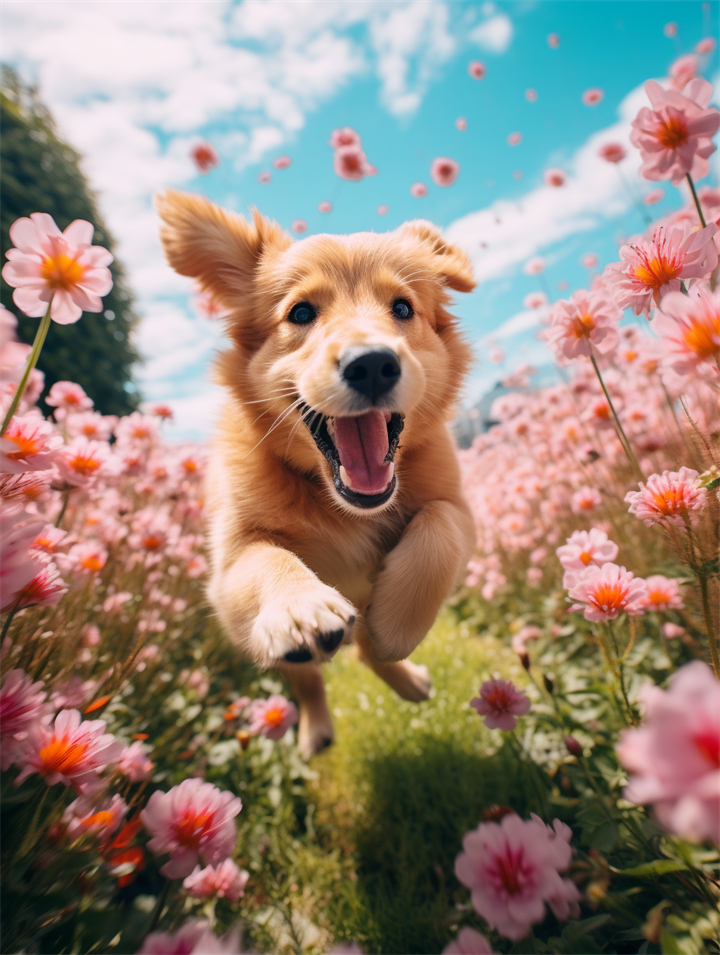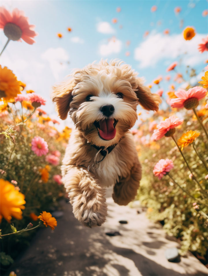 The little dog in the spring garden is cute and lively. In the warm spring, various flowers bloom in the garden, the sun shines on the green grass, and the little dog jumps and runs among the flowers, bringing joy and vitality to people.The little dog was very excited to smell the fragrance of the flowers, jumped up and bit a beautiful flower, or chased after the petals dancing in the wind.