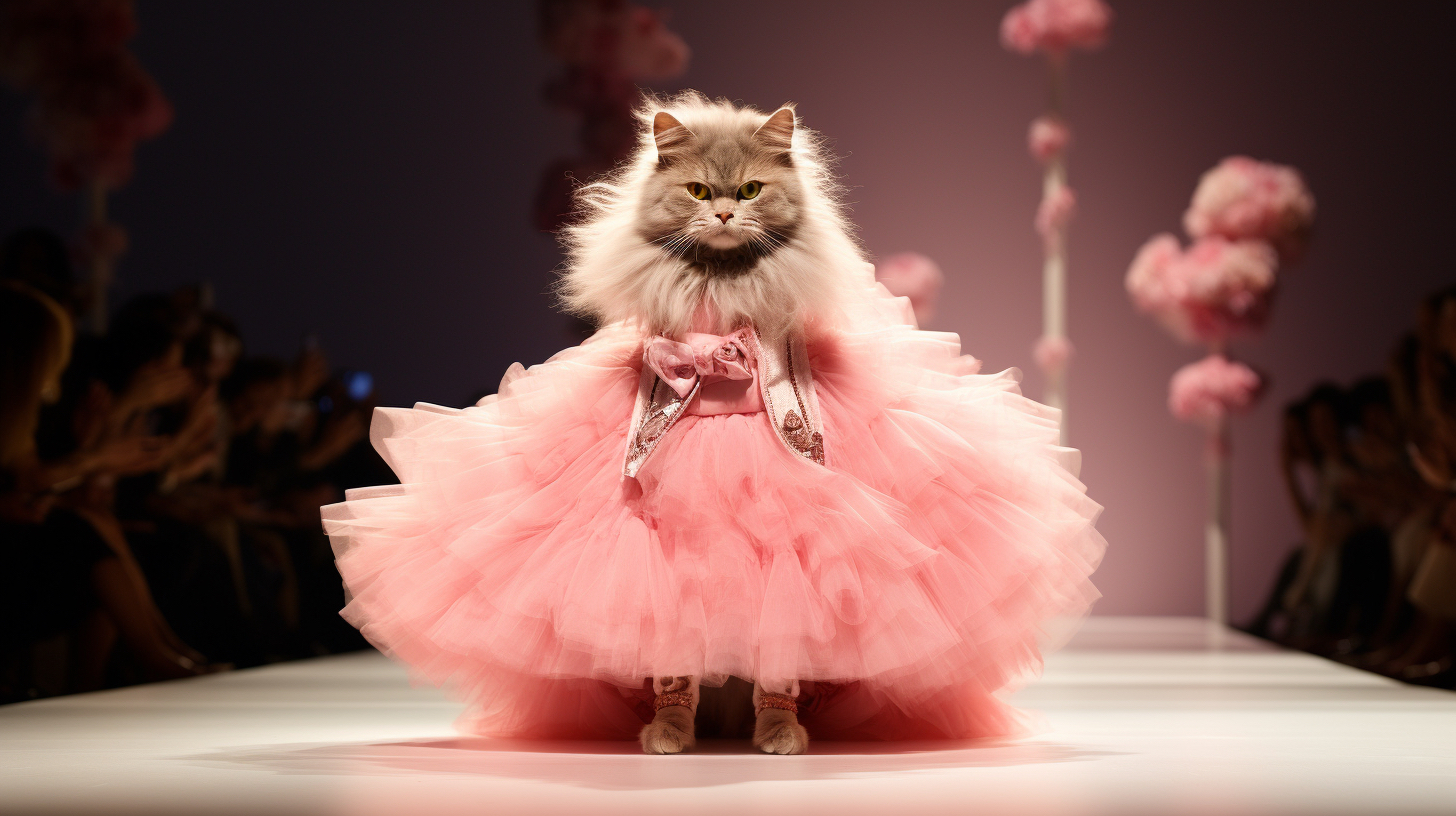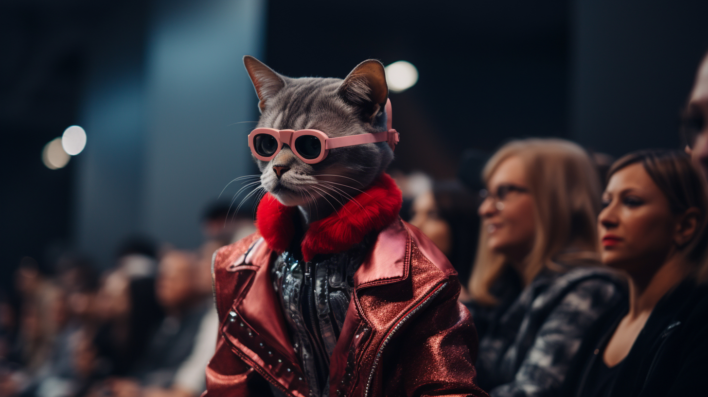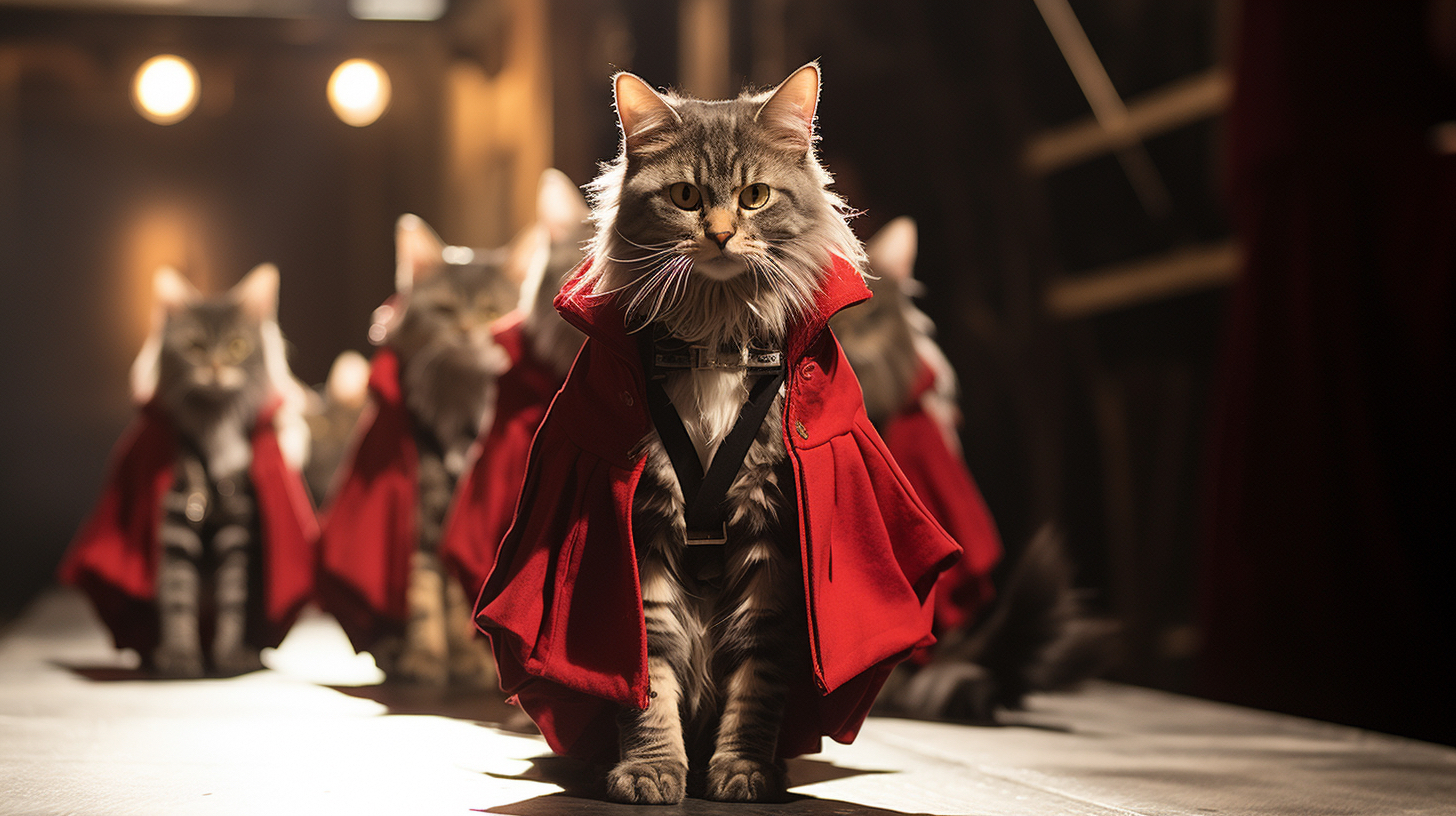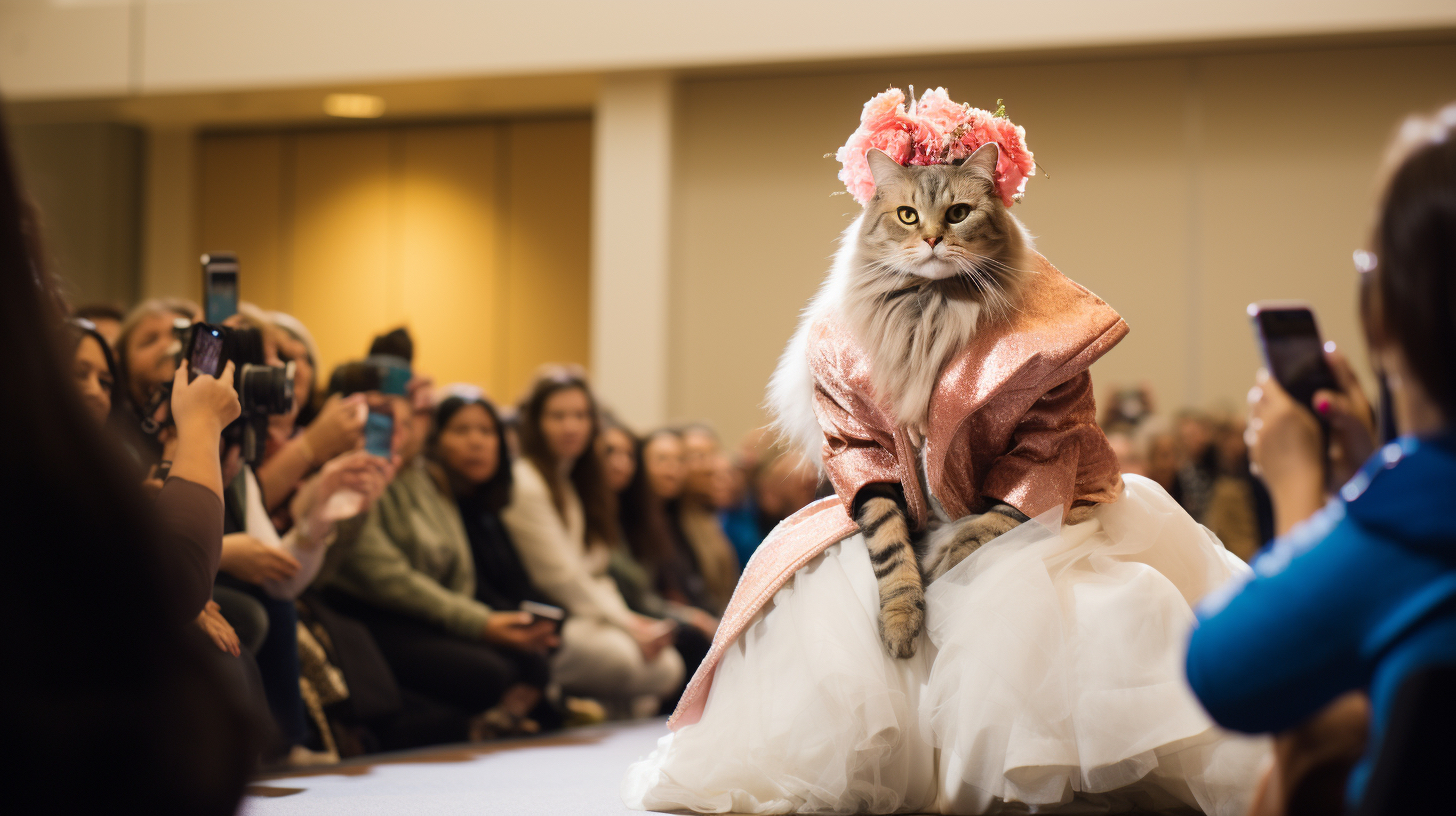 Cats on fashion shows usually wear carefully designed fashion clothing, such as dresses, fashion or accessories, highlighting trends and fashion elements. Cats may confidently walk around on the T-stage, showcasing their elegant posture and fashionable charm. They may exhibit various shapes and movements, combined with music and lighting effects, to showcase a unique style and fashion trend to the audience. It is an interesting and interactive artistic expression that combines fashion and animals, bringing people joy and visual enjoyment.