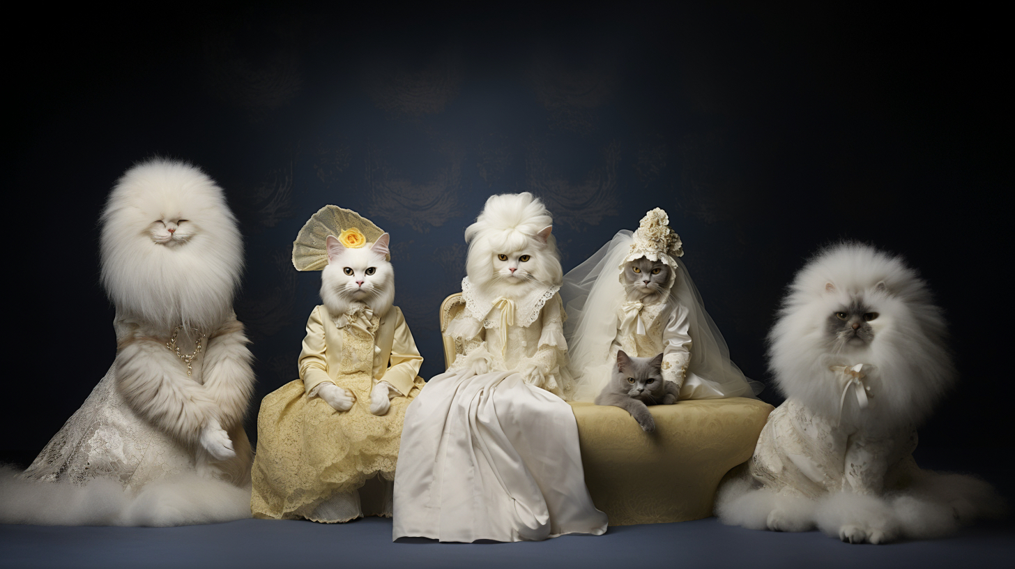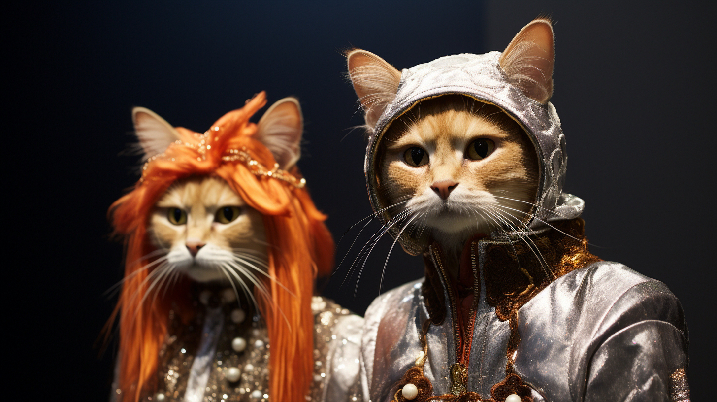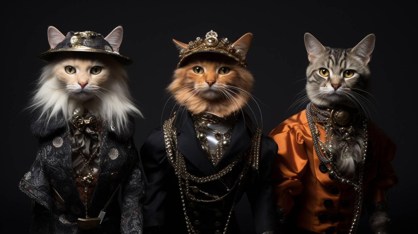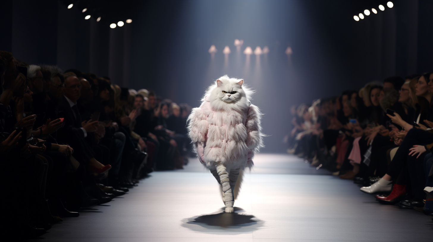 Cats on fashion shows usually wear carefully designed fashion clothing, such as dresses, fashion or accessories, highlighting trends and fashion elements. Cats may confidently walk around on the T-stage, showcasing their elegant posture and fashionable charm. They may exhibit various shapes and movements, combined with music and lighting effects, to showcase a unique style and fashion trend to the audience. It is an interesting and interactive artistic expression that combines fashion and animals, bringing people joy and visual enjoyment.
