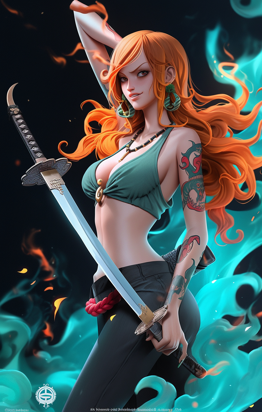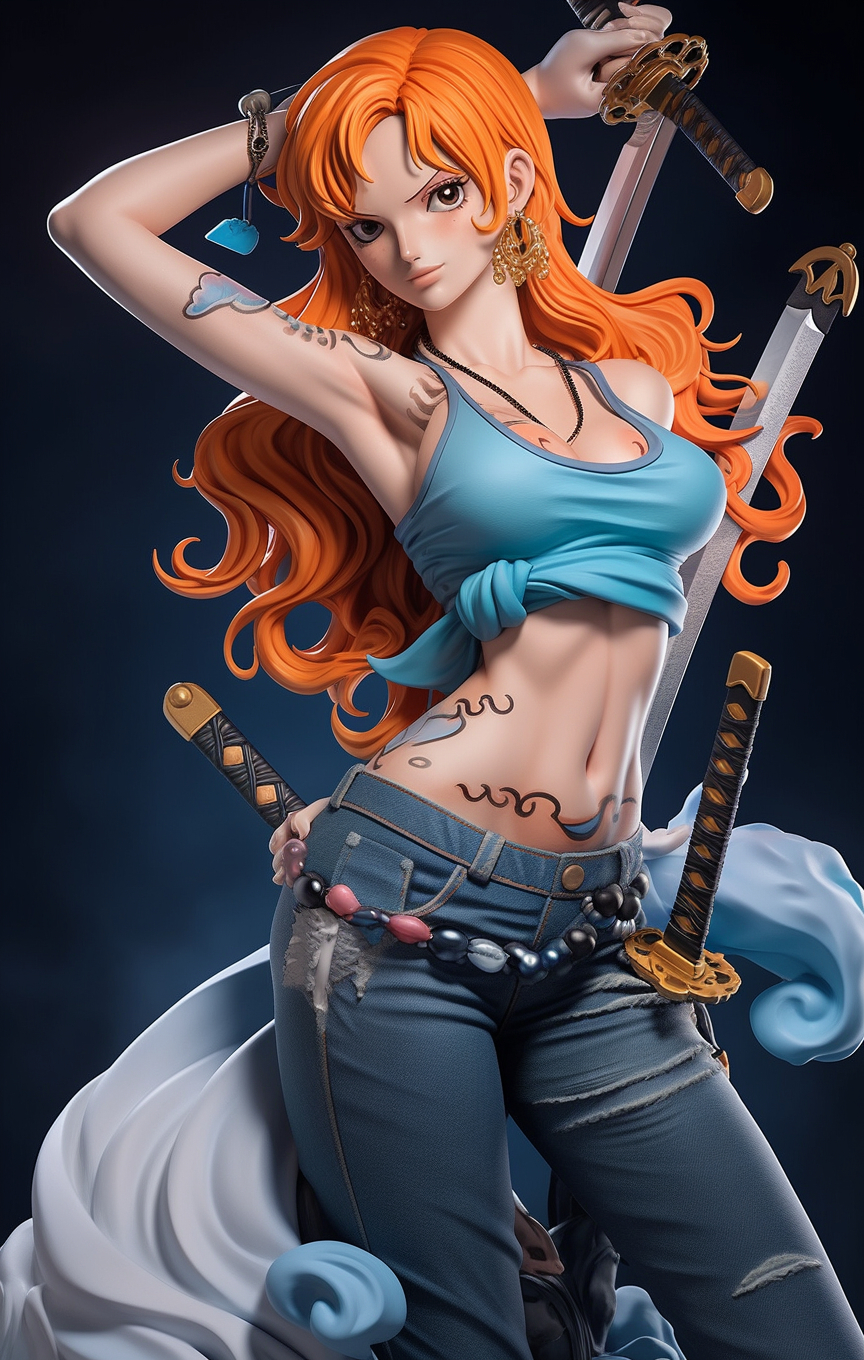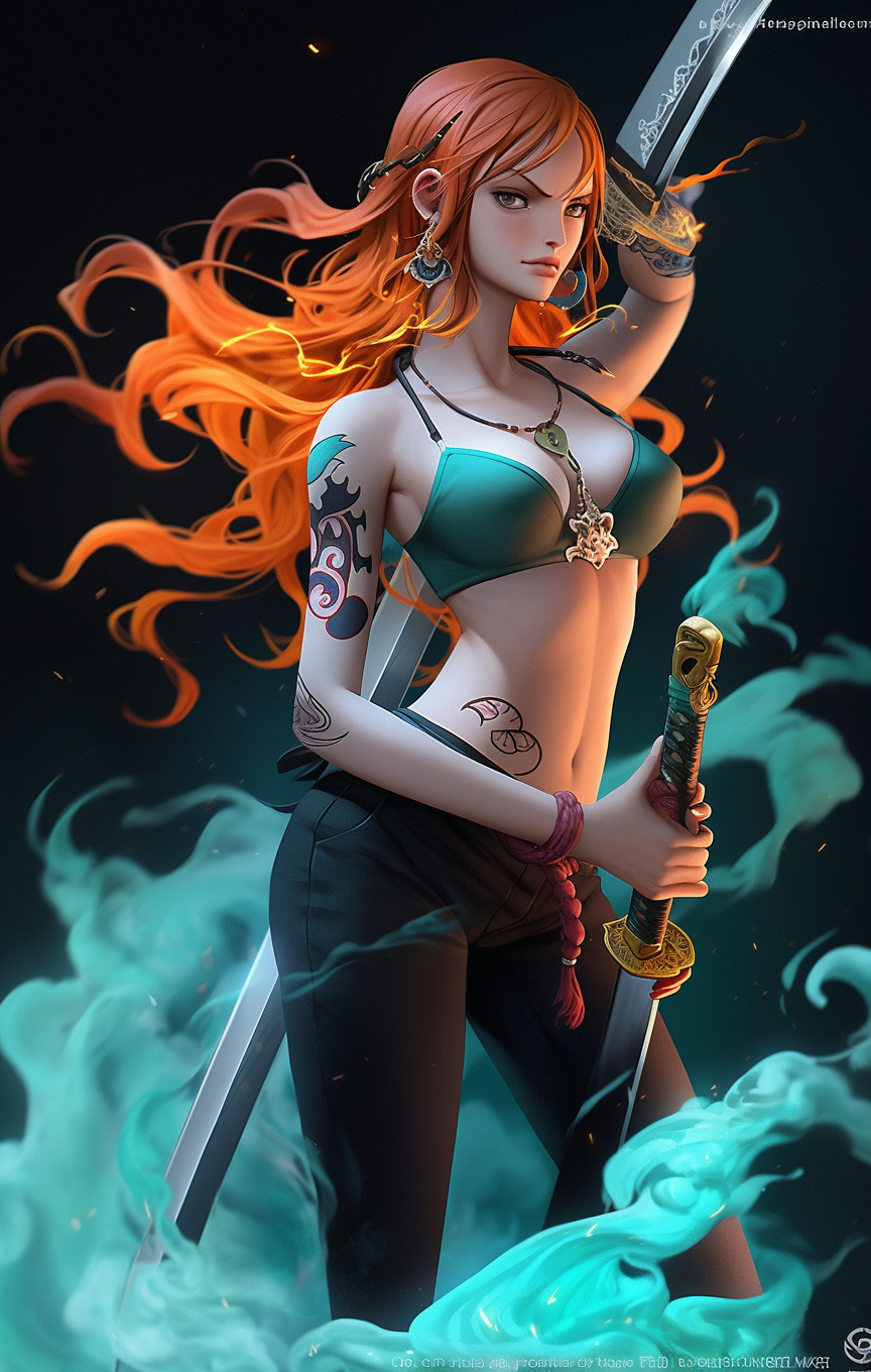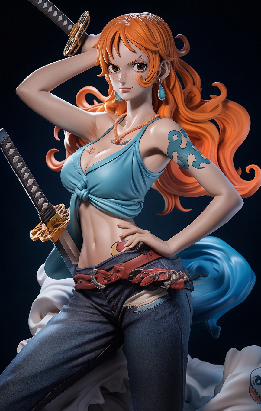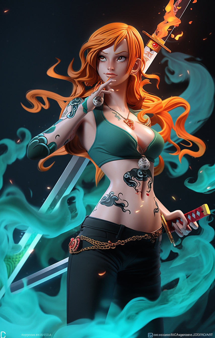Nami is a member of the Straw Hat Pirates, a powerful navigator and weather expert. She uses a cane as a weapon and can control the weather and climate, possessing strong combat effectiveness. Sauron is a swordsman of the Straw Hat Pirates, and he is a very powerful warrior. Sauron uses three swords as weapons, and his swordsmanship is exquisite, his strength is astonishing, and he is skilled in various techniques and combat skills. They have gone through many adventures and battles, not only demonstrating their strong abilities, but also demonstrating a spirit of upholding justice and friendship.