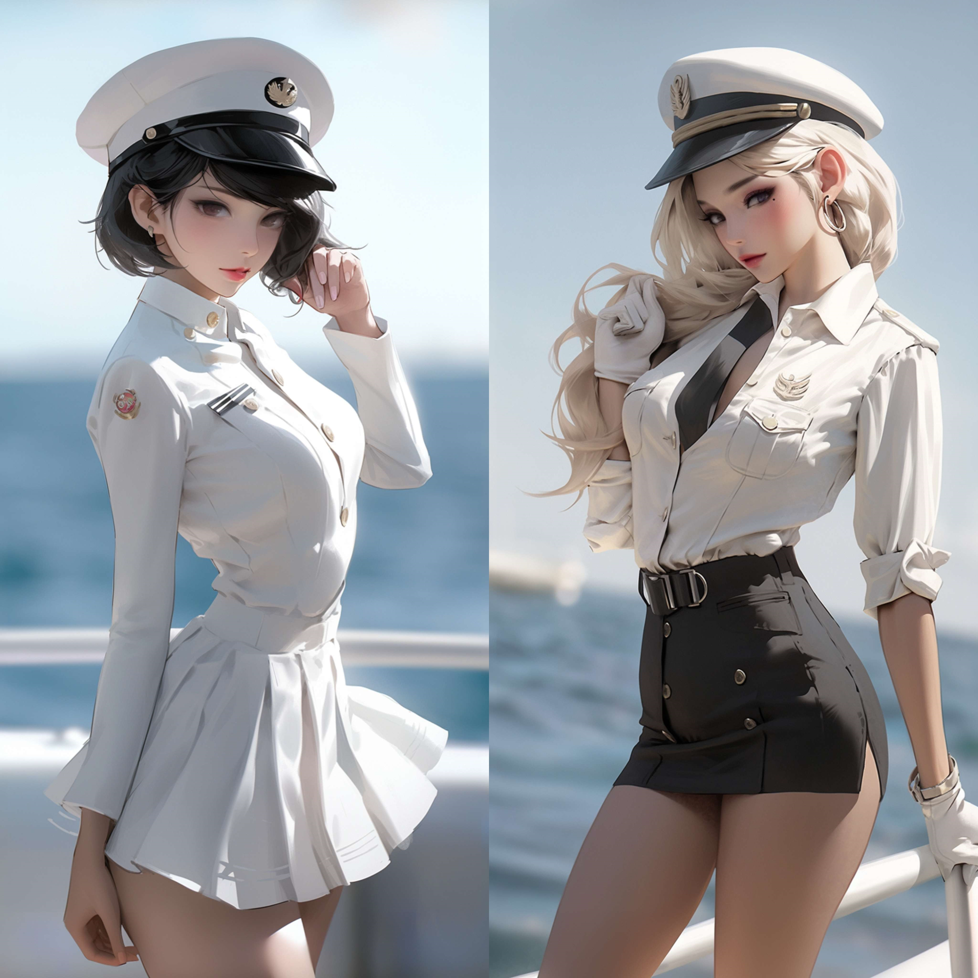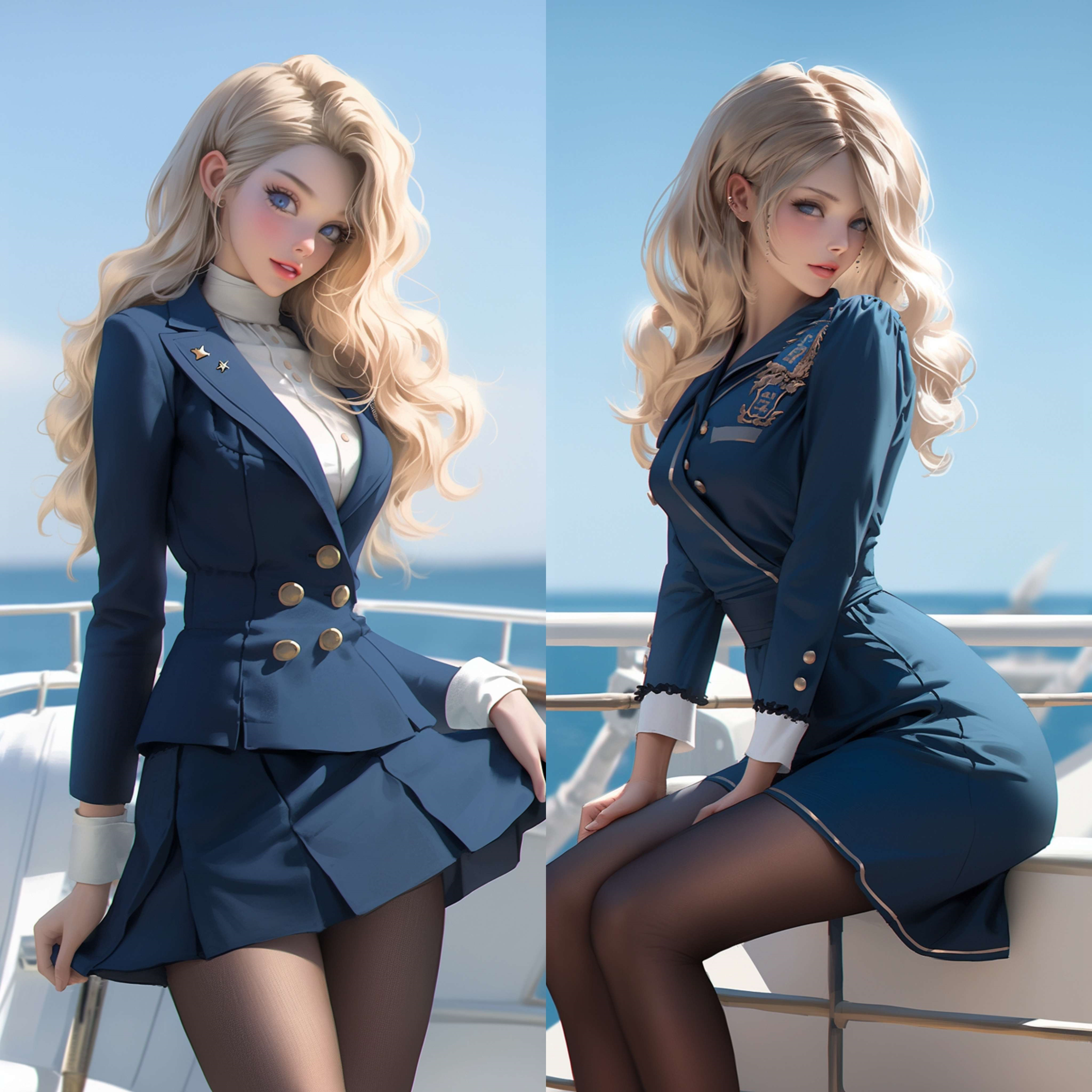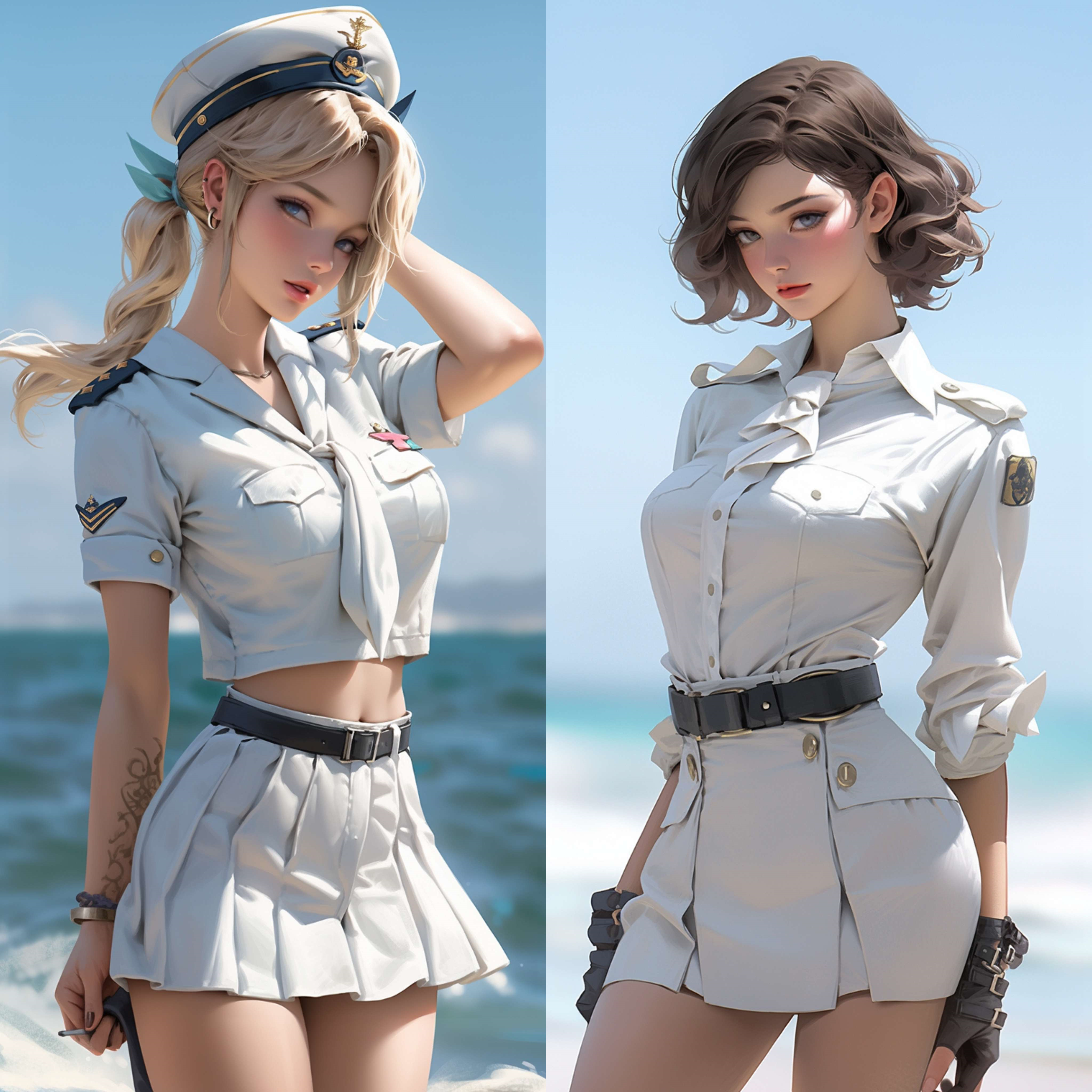 The female officer guarding the sea is a majestic and noble warrior. She was wearing a blue military uniform with a golden badge embroidered on it, representing her identity and prestige. Her military uniform fits snugly, showcasing her muscular physique and well-trained muscles.