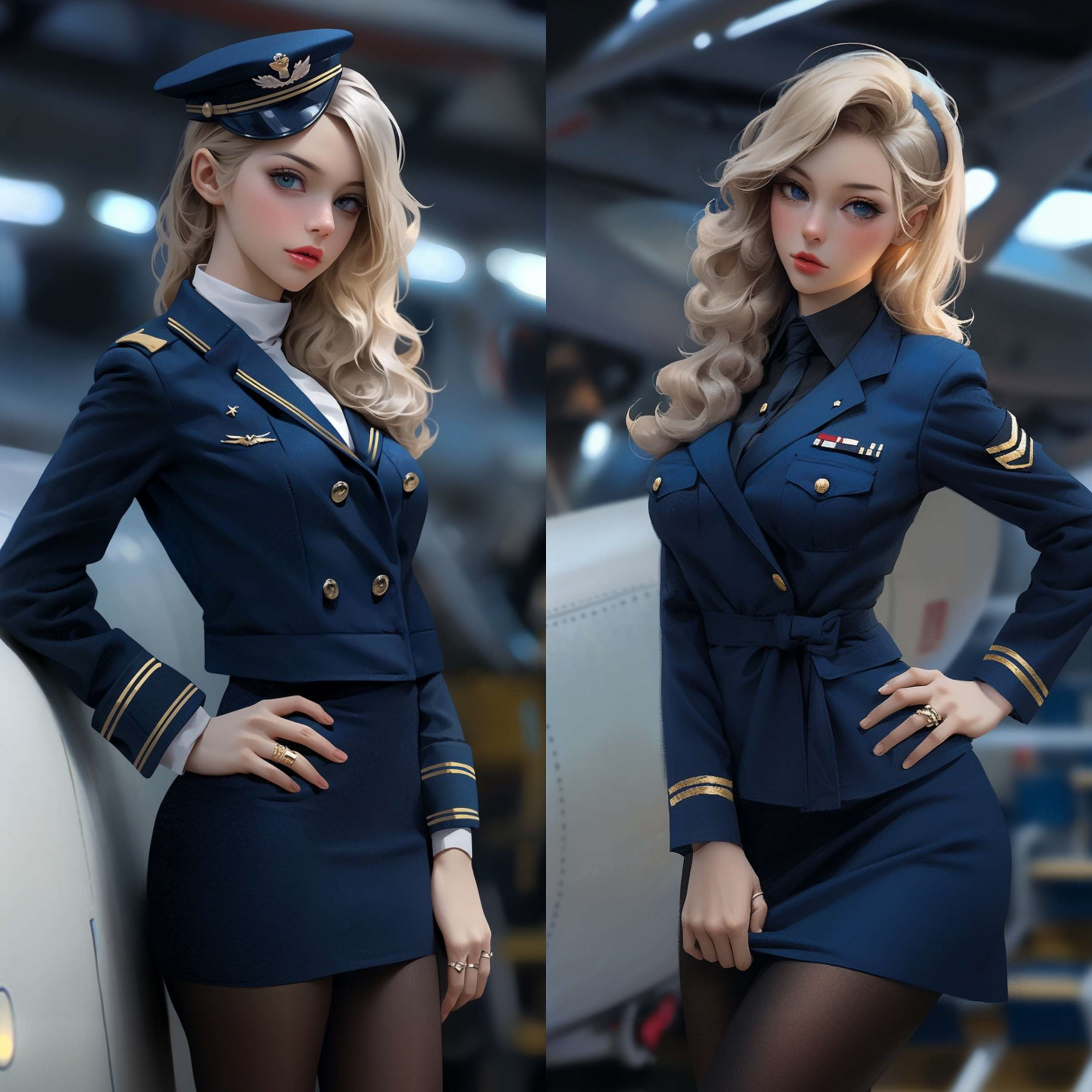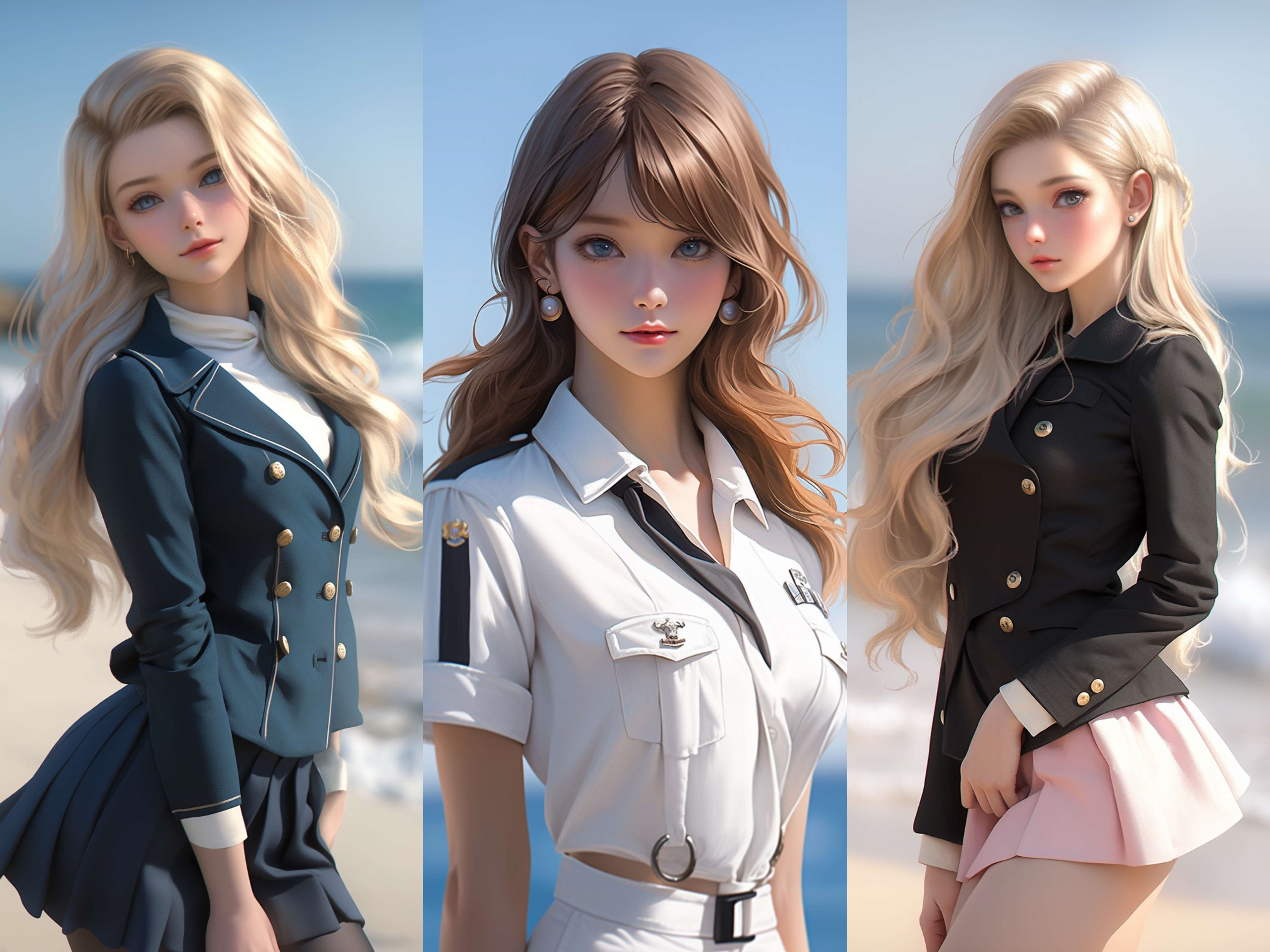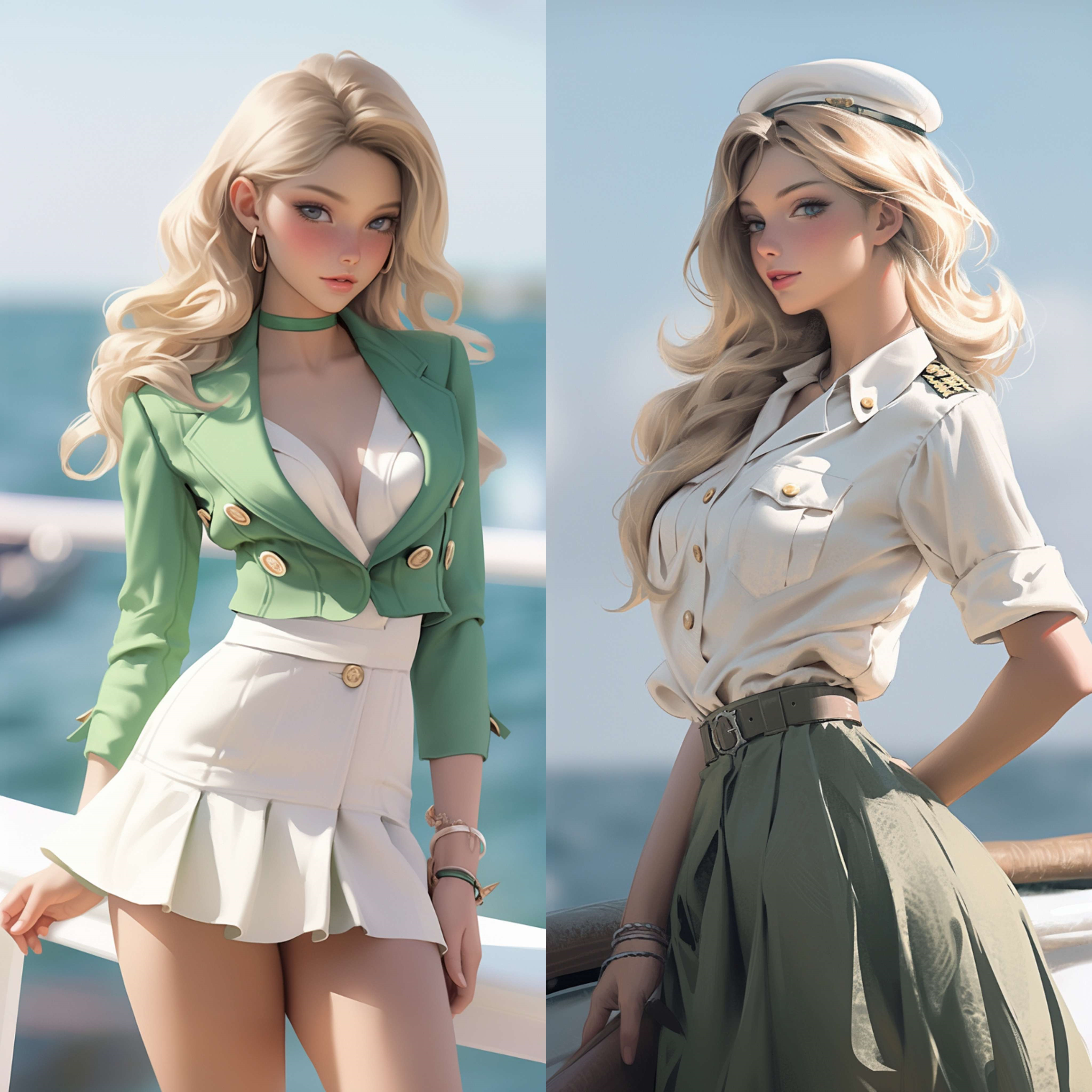 The female officer guarding the sea is a majestic and noble warrior. She was wearing a blue military uniform with a golden badge embroidered on it, representing her identity and prestige. Her military uniform fits snugly, showcasing her muscular physique and well-trained muscles.